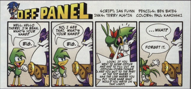 Die Diskussion wurde unterbrochen, als Marcos und Aerial einen Felidaekämpfer in ihrem Dorf ausmachen, wo es sich herausstellte, dass es Big war, der von Reynard Wolf und einigen anderen Wölfen bedroht wurde und Sonic schnell eingriff, um zu erklären, dass Big nicht böser Natur wie die Felidaes es seien, wie es Lobo zuvor beschrieben hatte ("greedy, savarge Felidae.").