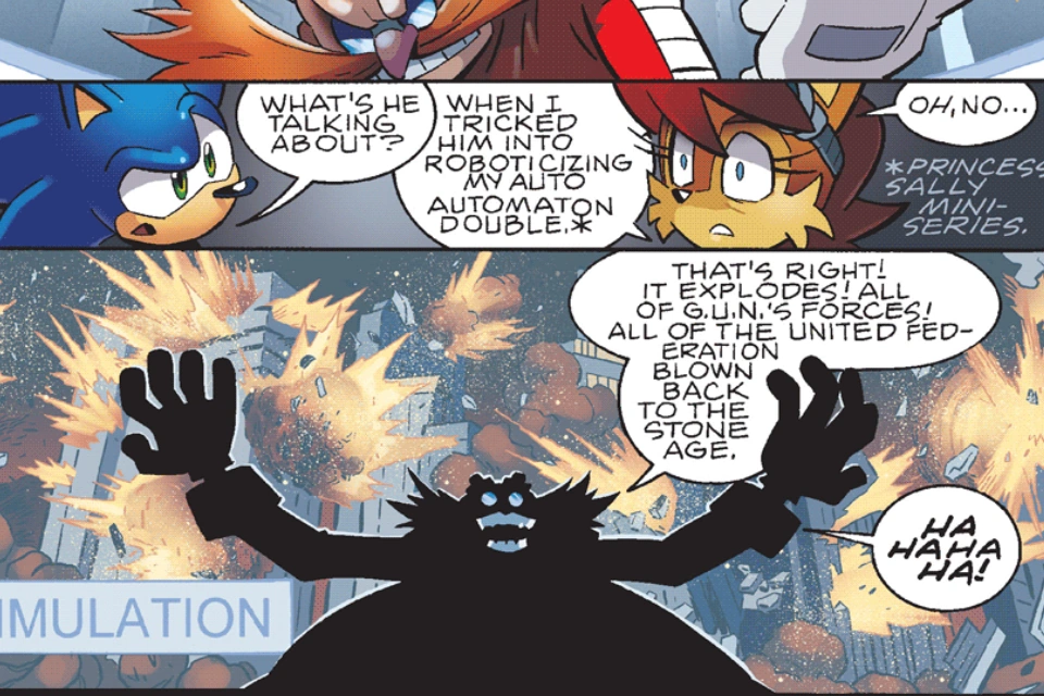 Inzwischen hielt Dr. Eggman weiterhin die Taste gedrückt, um die Operation Clean Sweep zu starten, doch durch das Zurückspulen der Zeit in den Genesis Comics findet diese geplante Operation nicht statt, Eggman gerät in Rage, dass er es wieder einmal nicht geschafft hatte, Sonic zu besiegen und fängt sich wieder, um den blauen Igel zu folgen ("The day is not lost!(…)“).