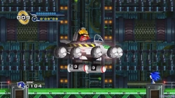 - Seine erste Phase ähnelt dem normalen Kampf des Originals. Diesmal kann jedoch Sonic the Hedgehog direkt getroffen werden und die Bewegungen des Bosses haben sich ein wenig geändert. Das Berühren der Mini-Eggmans schadet dem Spieler auch noch zusätzlich. Nach vier Treffern zerstören sich alle Metalleier und der Raketenantrieb vom Egg-Mobil schaltet sich automatisch an und die zweite Phase beginnt nun.