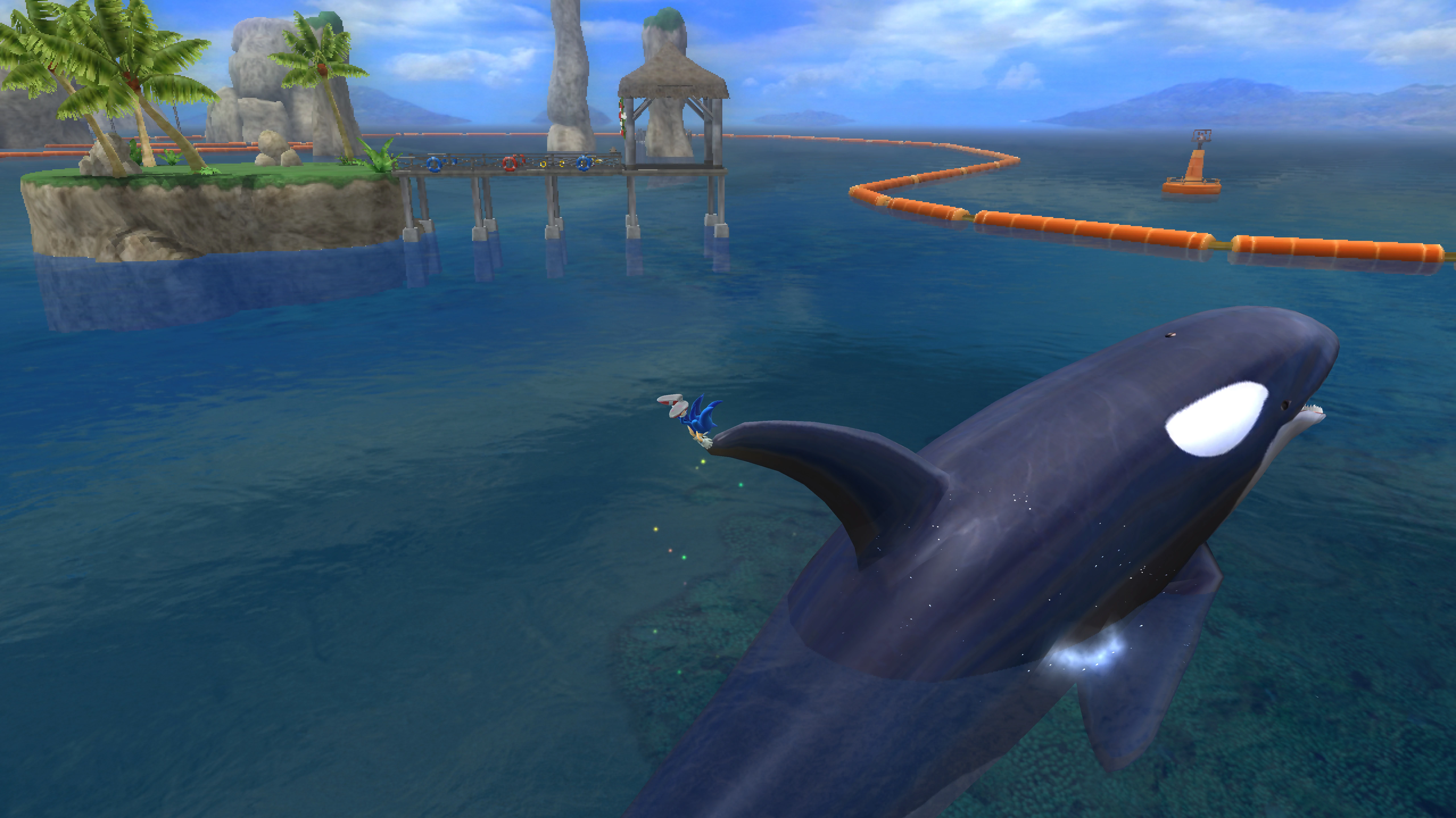 Classic Sonic läuft und springt über eine lädierte Holzbrücke und weder ins Wasser unterhalb vom ihm fallen noch sich vom Orca treffen lassen. Bei Modern Sonic ist der Orca deutlich aggressiver, da beispielsweise der Orca am Ende des Levels aus dem Wasser springt um in seinem letzten Versuch Sonic fressen zu können. Sonic muss anfangs über eine Holzbrücke rennen, während der Orca hinter Sonic die Brücke stadial zerstört bis Sonic eine Spring erreicht. Sonic muss nun in der Luft Trick Aktionen ausführen um den Orca-Bissen auszuweichen. Am Ende fliegt Sonic durch eine Lücke zwischen einer erhöhten Plattform, während der Orca sich aufgrund seiner Größe nicht durchquetschen kann, weshalb er sich an jener Plattform anschlägt und wieder ins Wasser zurückfällt. Derweil landet Sonic direkt vor dem Goal Ring.