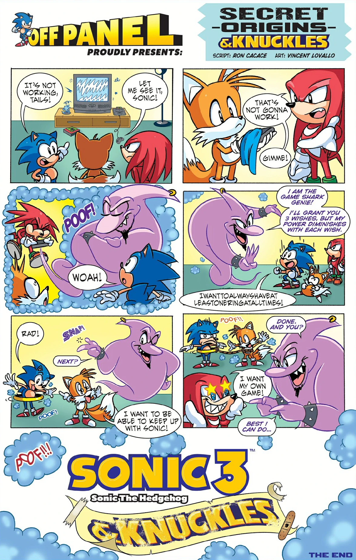 Knuckles beschwört den Game Shark Genie, indem er auf ein Modul bläst, und diese teilt dem Trio mit, dass er drei Wünsche erfüllen wird, aber seine Kraft nimmt mit jedem Wunsch ab. Sonic wünscht sich immer mindestens einen Ring, wodurch sich ein ziemlich großer Ring um seinen Oberkörper legt. Tails möchte mit Sonic mithalten können, wodurch ein Seil an Tails und Sonics Ring gebunden wird, was den Igel ärgert. Schließlich wünscht sich Knuckles sein eigenes Spiel, aber der Geist fügt die Worte "& Knuckles" nur schlecht unter ein kühn poliertes Logo für Sonic the Hedgehog 3.