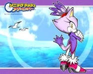 | Blaze ist auch einer der spielbaren Charaktere. Sie ist diejenige, die alle Sol Emeralds finden muss. Außerdem besitzt sie eine gute Feuergabe. Sie muss bestimmte Bosse erneut besiegen oder Akt-Level wiederholen, um die Sol Emeralds zu bekommen. | |