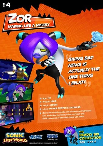 Zor (jap. ゾア Zoa) ist ein Mitglied der Schrecklichen Sechs. Er hat seinen ersten Auftritt in Sonic Lost World, wo er einen der sechs primären Antagonisten des Spiels darstellt.