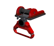El motor de tracción de la polea es una plataforma gris flotante con bordes rojos. Colgando de la parte inferior de esta plataforma a través de un cable negro hay un asa roja en una culata gris que tiene rayas de peligro amarillas y negras pintadas.