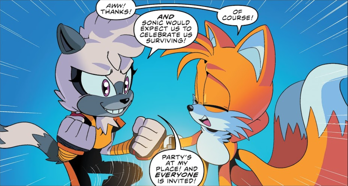 Tails discute avec Amy de la suite des événements. Amy dit qu'elle doit retourner à la Restoration poursuivre le projet, Tails lui dit de faire une pause avec ça. Amy lui répondit que tout aurait été plus vite si Knuckles n'avait pas dissocié la Resistance[4]. En revanche, Dr. Eggman a volé la navette de la Restoration et décolla avec. L'intervention de Zavok a retardé davantage son arrestation. Orbot et Cubot ont volé Omega et Metal Sonic les a reconduit sur la navette. Malgré l'intervention de Whisper et Shadow, Metal Sonic a permis à Dr. Eggman de partir[5]. Une fois Zavok en prison, Tails et Tangle sont partis délivrer Rough et Tumble, qui sont toujours prisonniers du trou dans lequel Sonic les avait bousculés[6]. Tandis qu'ils disent qu'ils sont stupides de les avoir sortis de là, Tangle et Tails murmurent que la prison les attend dehors et qu'ils peuvent se perdre. Cependant, Tangle s'inquiète que Sonic ne revienne pas. Tails la conforta qu'il reviendra, comme toujours, et que c'est à tout le monde d'assurer la protection du monde en son absence. Tangle décida donc de lancer une célébration en son honneur et tout le monde est invité. Comme convenu, Tails savoure la fête. Tout à coup, un mécha de Dr. Eggman tenant Omega en otage fit irruption[7]. Par ordre de Vector, Tails se mit à scanner le mécha. Avec l'aide de Rouge, il put atteindre le châssis et pirater le système. Alors que Dr. Eggman allait sortir la grosse artillerie, une comète en feu atterrit sur le champ de bataille ; c'est Sonic fraîchement revenu de la dimension de Blaze. Il délivra d'abord Omega, puis Omega détruit le mécha. Dr. Eggman battit en retraite, le temps qu'il prépare un nouveau plan dit infaillible. Amy d'abord, puis Tails et enfin tout le monde se rue sur Sonic, fous de joie de le revoir. En revanche, Jewel signala que le village est en feu. Sonic et Tangle se précipitèrent éteindre les feux. Amy dit que Sonic ne s'arrête jamais, un avis que Tails partage[8].