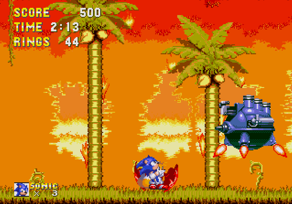 Od tego momentu całe Angel Island Zone stoi w płomieniach, ale wpływa to jedynie na zmianę palety. Sam ogień jest nieszkodliwy dla postaci. W drugiej połowie Angel Island Zone pojawia się więcej przejść wewnątrz jaskiń, zwykle zamaskowanych za wielkimi skałami, które można rozbijać wykonując Sprint obrotowy. Pojawiają się też zniszczalne grunty i podwodne jaskinie. Zza tutejszych wodospadów co jakiś czas na krótki okres wynurzają się platformy, z których gracz może skorzystać. Pojawiają się także drewniane pomosty, rozpadające się po kontakcie z graczem. W sekcjach naziemnych, a także podwodnych spotkać można Catakiller, Jr., które elektryzują swoje ciała w celu ochrony przed graczem.