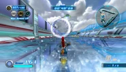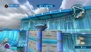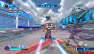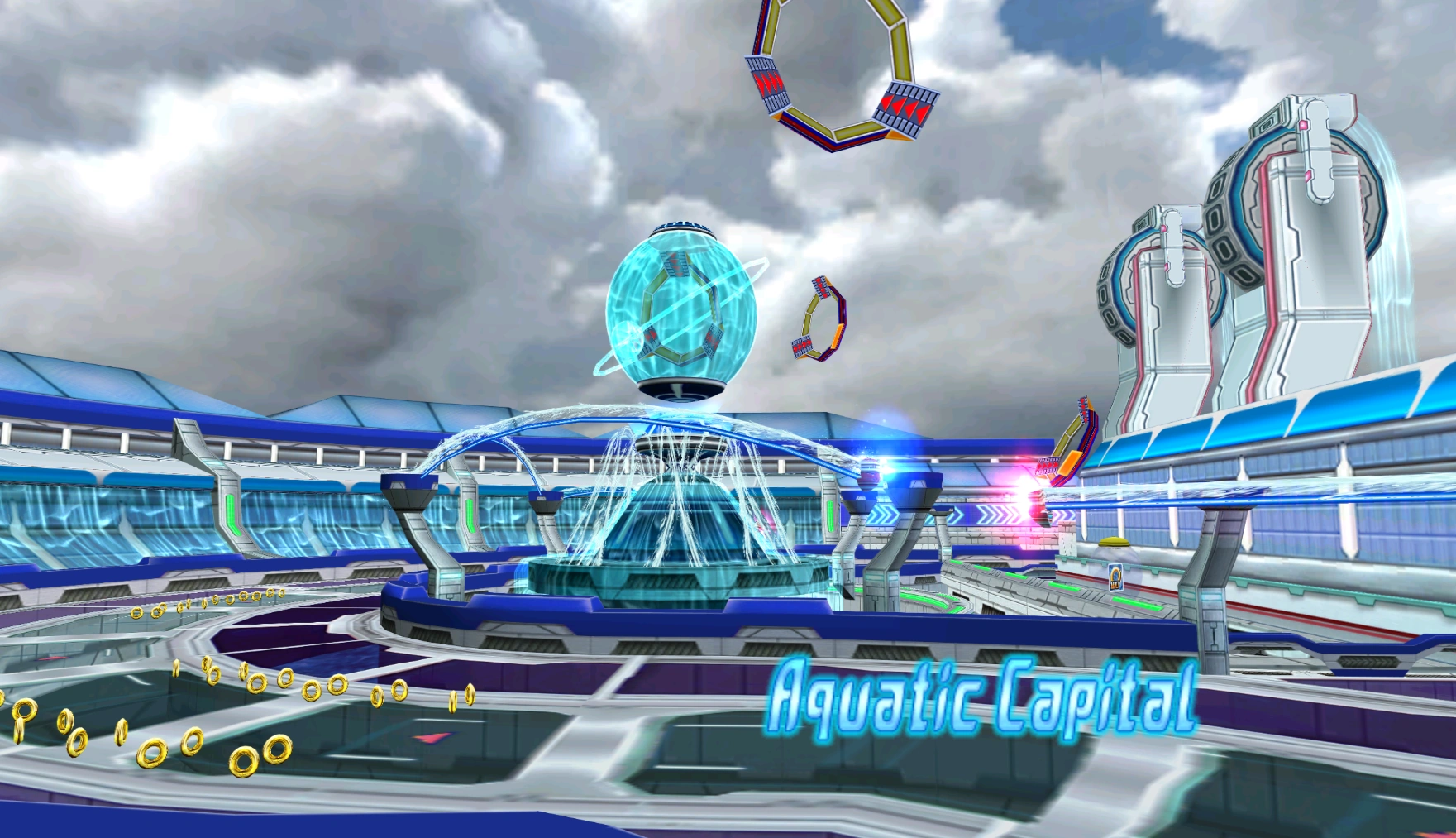 Aquatic Capital to trasa położona w futurystycznym mieście z wodnymi ulicami i zjeżdżalniami. W tle unoszą się również wodne kule, a po ulicach płyną nowoczesne gondole. Na początku wyścigu gracze podjeżdżają do rampy, mając po bokach strzelające wodą gejzery. Po wyskoczeniu z rampy można wylądować na wodnej ulicy na dole, lub wykorzystać Gravity Control aby dotrzeć na położoną wyżej zjeżdżalnię wodną. Zjeżdżalnia ta jest tunelem, przez który przepływa strumień wody. Podczas zjeżdżania postać zeskakuje z deski i ślizga się - można się wtedy przemieszczać na boki, aby zbierać pierścienie. Pierwsza zjeżdżalnia pozwala pominąć praktycznie całą pierwszą sekcję. W innym wypadku gracze będą musieli jechać przez wodne ulice, które rozwidlają się na dwie przecinające się dwukrotnie tory. Jadąc cały czas prawą stroną można natknąć się na wzniesienie, prowadzące zwykłą, brukowaną ulicą. Gracze będący w trybie ataku lub biegnący w jakikolwiek inny sposób pieszo mogą wykorzystać szeroką sprężynę, od którego odbiją się do serii mniejszych sprężyn, pozwalających pominąć praktycznie całą sekcję. W innym wypadku można ominąć sprężynę i wrócić na główną trasę. Przy drugim rozwidleniu, w prawej uliczce znajduje się rampa. Można się nią odbić prosto do korytarza, pozwalającego szybciej ukończyć sekcję, albo do pierścieni przyspieszających, jeśli posiada się Air Ride, oraz polecieć nad resztą sekcji. Z kolei przy pierwszym rozwidleniu po lewej znajduje się inna rampa, z której można się odbić i za pomocą Gravity Control przyczepić do biegnącej po lewej wodnej ściany, która ciągnie się długo przez całą sekcję. Za pomocą rampy można również wskoczyć na wodną szynę, jeśli postać może po nich jeździć. Podczas jazdy będzie również można wskoczyć na kolejną szynę, gdy pierwsza się skończy. Z kolei postaci jadące na motocyklach mogą się trzymać lewej strony i przy drugimm rozwidleniu zniszczyć bramę tunelu, w którym zaparkowane są gondole możliwe do niszczenia. Wszystkie trasy zbiegają się następnie w jedną i prowadzą do ostrego zakrętu w prawo. Postaci biegnące pieszo mogą trzymać się lewej strony po zakręceniu, aby wbiec po schodach przez barierę i wskoczyć do gondoli. Zabierze ona gracza wodnym tunelem. W trakcie jazdy można sterować gondolą na boki, aby zbierać pierścienie. Gondola pozwala pominąć całą nadchodzącą sekcję, która rozpoczyna się od wyskoczenia z rampy. Po raz kolejny gracze mogą wskoczyć na górne lub dolne piętro, ale tym razem oba składają się z wodnych zjeżdżalni. Należy w nich uważać na płynące czasami gondole, z którymi można się zderzyć. Gracze wyjeżdżają następnie na otwartą przestrzeń i mogą wykonać Gravity Dive, a następnie odbijać się od unoszących się po bokach kul wodnych, aby utrzymywać punkty grawitacji. Postaci wykorzystujące Air Ride mogą wjechać na pas startowy i polecieć przez pierścienie przyspieszające, przecinające się z wodną wieżą pośrodku, aby pominąć nadchodzący zakręt wokół owej konstrukcji. Postaci jadące po szynach mogą wykorzystać dwie następujące po sobie szyny aby ominąć zakręt. Po prawej pojawia się również zamknięta przestrzeń, z kapsułą liczącą 100 pierścieni. Aby ją zebrać wymagana jest umiejętność Air Ride. Po pokonaniu zakrętu wokół wieży gracze jadą z powrotem do mety.
