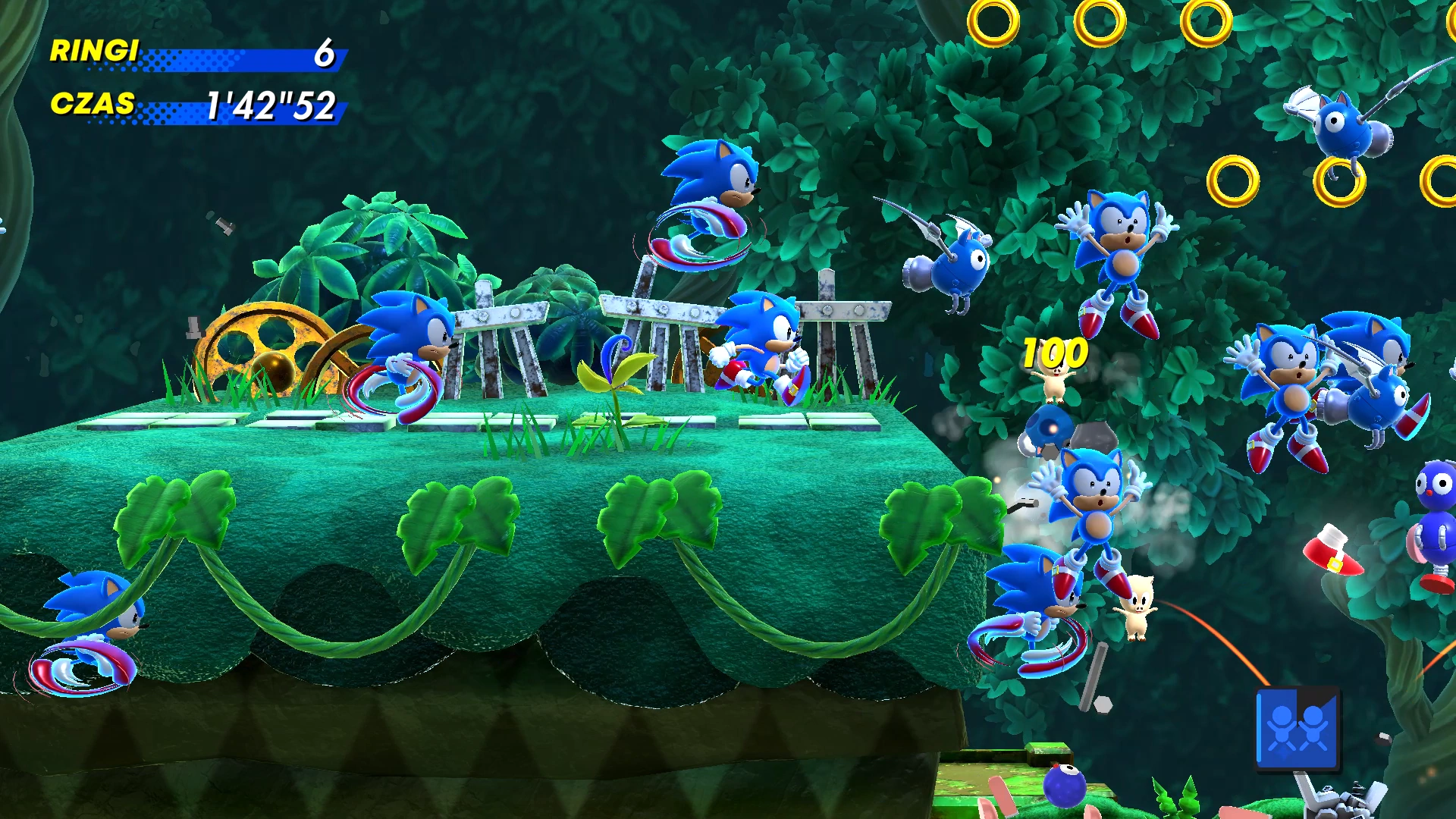 Po aktywacji mocy uruchomi się licznik czasu. W trakcie jej trwania, z lewej lub prawej strony ekranu co kilka chwil pojawiać się będzie na losowej wysokości kopia postaci gracza. Postać będzie biegła lub w inny sposób poruszała się przed siebie z jednej strony na drugą. Kierunek zależy od strony, po której się pojawiła; ta z kolei zależna jest od tego, w którym kierunku zwrócona była postać w momencie utworzenia kopii. Klony mogą wchodzić w interakcję z niektórymi elementami rozgrywki, takimi jak pierścienie czy zniszczalne bloki. Mogą także niszczyć przeciwników oraz zadawać uderzenia bossom, jednak po jednym razie giną.