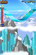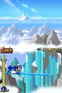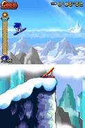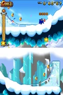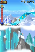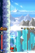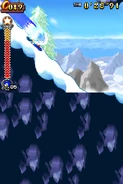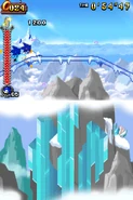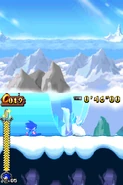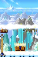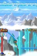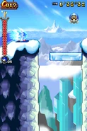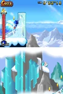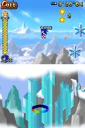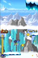 Przez większość aktu pierwszego gracz porusza się na snowboardzie. Postać automatycznie jedzie do przodu i nie może się cofać. Może skakać i zjeżdżać po lodowych szynach, a także korzysta z pozostałych elementów rozgrywki. Trasy po jakich porusza się gracz mogą być proste, a niekiedy stanowią je strome stoki. Czasami po tych stokach toczy się lawina, przed którą należy uciekać. Poza tym pojawiają się tutaj zamarznięte drążki, które działają jak bungee - gracz wjeżdża na końcówkę tego drążka, łapie się go i wyskakuje w górę. Oprócz tego na drodze pojawiają się lodowe rampy w kształcie tub. Postać jeździ od jednej do drugiej krawędzi tej rampy i wyskakuje w górę. Unikalny dla tego poziomu jest lodowy korkociąg. Niektóre sekcje składają się ze śliskiego lodu i biegnących w górę ramp. Kontrolowanie postaci jest tutaj utrudnione. W drugim akcie pojawiają się zwisające z sufitu, gigantyczne sople. Należy przeskakiwać na kolejne sople, ponieważ postać ześlizguje się w dół i może spaść do przepaści.