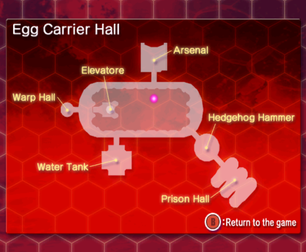 - Warp Hall – pokój umieszczony za Elevatore. Aby się do niego dostać, należy złamać prosty szyfr. Gracz musi skakać po pomarańczowych płytkach i wciskać je w odpowiedniej kolejności, tak aby utworzyły słowo EGGMAN. Jeśli gracz się pomyli, mechanizm pozmienia położenie liter, oraz zrzuci graczowi na głowę miskę. Po złamaniu hasła gracz będzie mógł wejść do pomieszczenia z pojedynczym teleporterem, który prowadzi do Egg Carrier Island.