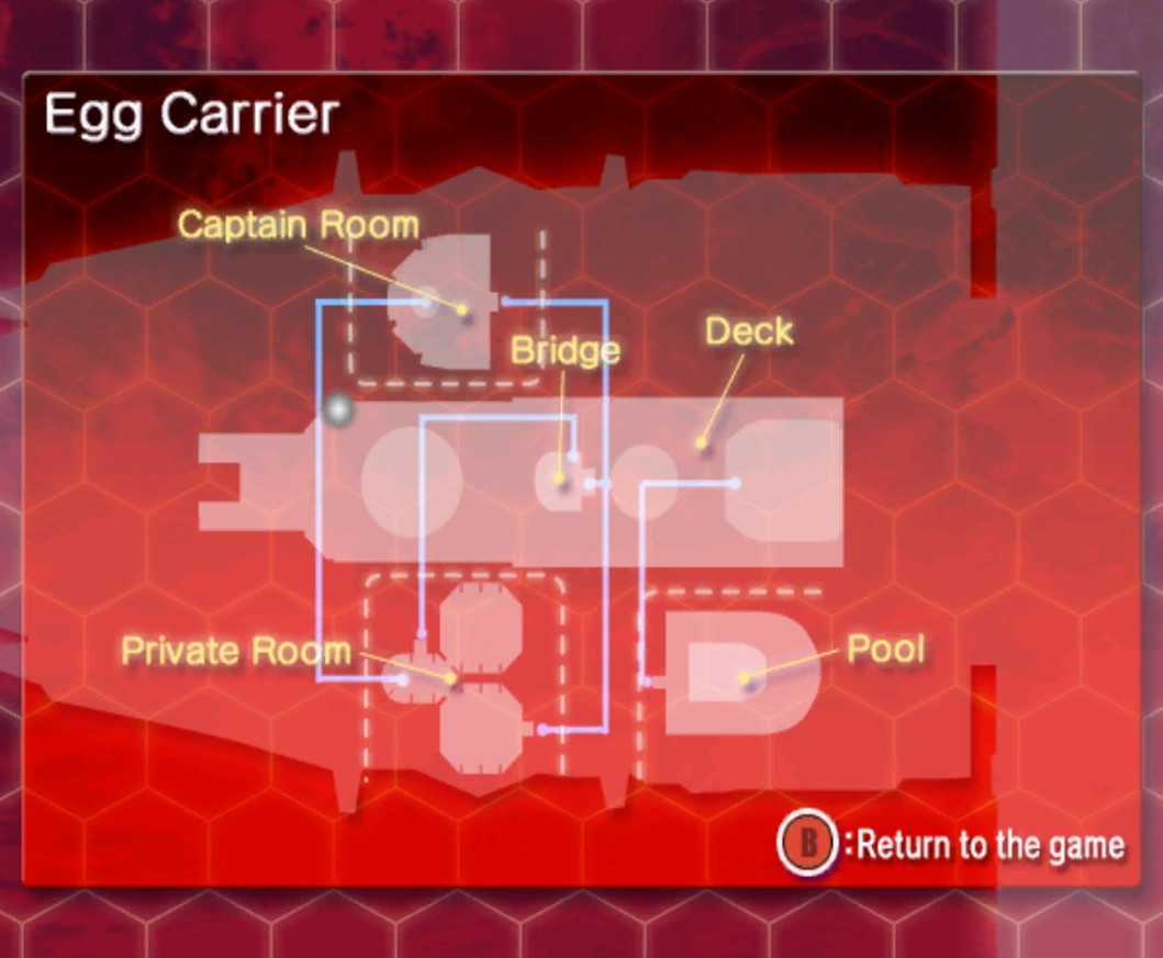 - Deck – górna część pokładu. Pojawiają się tu wejścia do mostku kapitańskiego i pokoju z basenem. Pojawia się tutaj także winda, którą gracz może zejść do Egg Carrier Hall.