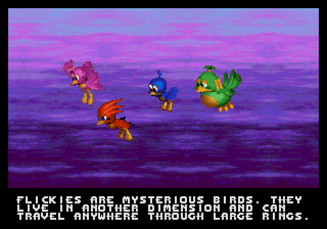 W grze Sonic 3D Blast, ukazana została Wyspa Flicky oraz zamieszkujące ją Flicky. Różnią się one od typowych Flicky. Mają specjalną zdolność - potrafią tworzyć wielkie pierścienie, za pomocą których podróżują między wyspą, a "wymiarem Flicky", w którym spędzają większość czasu. Eggman dowiaduje się o tej zdolności i napada na wyspę. Tworzy maszynę wytwarzającą pierścienie, aby wywabić ptaki z ich wymiaru i poddać je robotyzacji. Sonic dowiaduje się o całej sytuacji i rusza na pomoc zanim Eggman znajdzie Szmaragdy Chaosu.