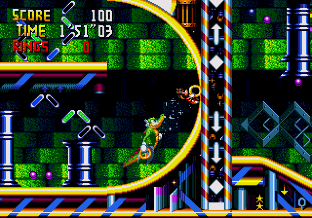 | Espio | Chodzenie po suficie | Espio może przyczepiać się do ścian i sufitów, oraz normalnie się po nich poruszać. Należy wcisnąć i przytrzymać przycisk skoku przy ścianie albo suficie. | |