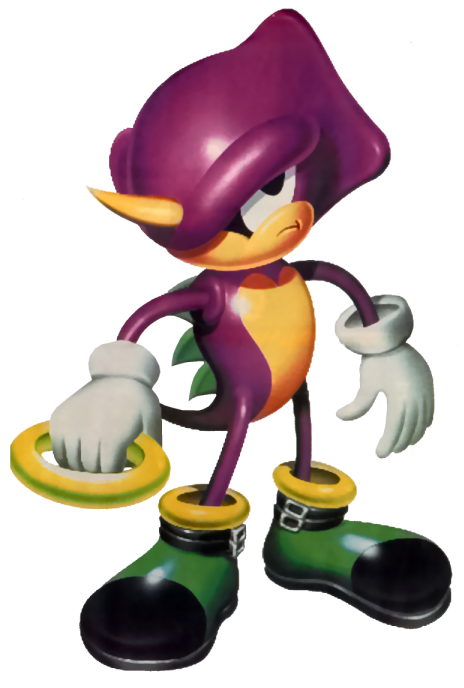 Kameleon detektyw, który postanowił zbadać Karnawałową Wyspę, po tym jak wyłoniła się z oceanu. Został jednak schwytany przez Doktora Eggmana[15]. Espio jest pierwszym partnerem gracza i ratuje się go na Isolated Island. Potrafi przytwierdzać się do każdej powierzchni, w tym do sufitów, i biegać po niej tak jak po normalnym gruncie. Oprócz tego zmienia kolory podczas czekania w miejscu. |