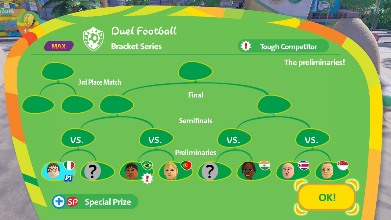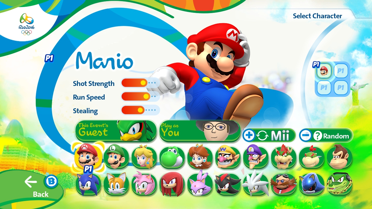 W wersji na Wii U gracz rozpoczyna na plaży Copacabana, która stanowi hub. Standardowe menu główne zostaje odblokowane po zdobyciu medalu w turnieju po raz pierwszy. Gracz, jako Mii, może swobodnie eksplorować plażę i rozmawiać z przebywającymi na niej postaciami, którymi mogą być także Mii innych graczy. Gdy gracz rozmawia po raz pierwszy z Mii o innych narodowościach albo postaci z Team Sonic lub Team Mario, otrzymuje ich flagi. Plaża składa się także z kilku miejsc, w których gracz może przystąpić do różnych trybów rozgrywki czy też do okien menu. W centrum mieści się stadion Maracana, gdzie gracz może porozmawiać z Orbotem aby rozegrać mecz dla jednego gracza, albo z Cubotem dla trybu wieloosobowego. Brama turniejowa pojawia się po tym jak gracz wygra w pięciu pojedynczych meczach. W turniejach gracz może wybrać ilość graczy biorących udział, jeśli porozmawia z zielonym Toadem. Niebieski Toad uruchamia tryb turniejowy. Po przejściu pierwszej fazy drugiego turnieju pojawia się monitor Miiverse. Gracz może tutaj oglądać wiadomości wysyłane przez innych graczy, a także porozmawiać z czerwonym Toadem aby wysłać swoją wiadomość. Po wygraniu w siedmiu pojedynczych meczach pojawia się arena versus, gdzie gracz może wziąć udział w trybie Heroes Showdown. Rozmawiając z Charmy Bee można rozegrać jednoosobową wersję, a z Birdo wieloosobową. Wraz z tą areną pojawia się także piedestał, przy którym można porozmawiać z Shy Guy'em. Gracz może tutaj zmierzyć się z duchami innych graczy w trzech wydarzeniach: biegu na 100 metrów, sztafecie 4x100 metrów i 100 metrach stylem dowolnym. Po ukończeniu turnieju poziomu trzeciego, odblokowana zostaje Pousada, gdzie gracz może porozmawiać z Bigiem. Pełni ona funkcję galerii, w której gracz może przeglądać zebrane przez siebie przedmioty, zmienić swój ubiór, muzykę podczas wydarzeń, wyświetlić swój profil, albo zmienić ustawienia czy wyświetlić listę twórców. Co każde pięć zdobytych złotych medali na plaży pojawia się Lakitu, który przyznaje graczowi 30 pierścieni i tyle samo monet. Ich ilość jest dwukrotnie większa jeśli Mii nosi kostium Lakitu. Z czasem odblokowywane są także stoiska z przedmiotami. Gracz może tutaj zakupić przedmioty za monety al bo pierścieni. Za 5 monet albo pierścieni gracz może otrzymać jeden przedmiot, podczas gdy za 50 jednostek obu walut można otrzymać 11 przedmiotów. Są one losowo wybierane, przy czym ten sam przedmiot można otrzymać więcej niż jeden raz. Kolory skrzyń wskazują na typ przedmiotu: w żółtych mieszczą się czapki, w czerwonych ubrania, w zielonych pieczątki, a w jasnoniebieskich utwory muzyczne. W grze można odblokować trzy stoiska: Stoisko Rio 2016 które prowadzi Omochao (pojawia się po zdobyciu złotego medalu w trzech turniejach), Stoisko Sonica prowadzone przez Cream (odblokowane po ukończeniu 16 turniejów), oraz Stoisko Mario prowadzone przez Pianta (odblokowane po ukończeniu 18 turniejów).