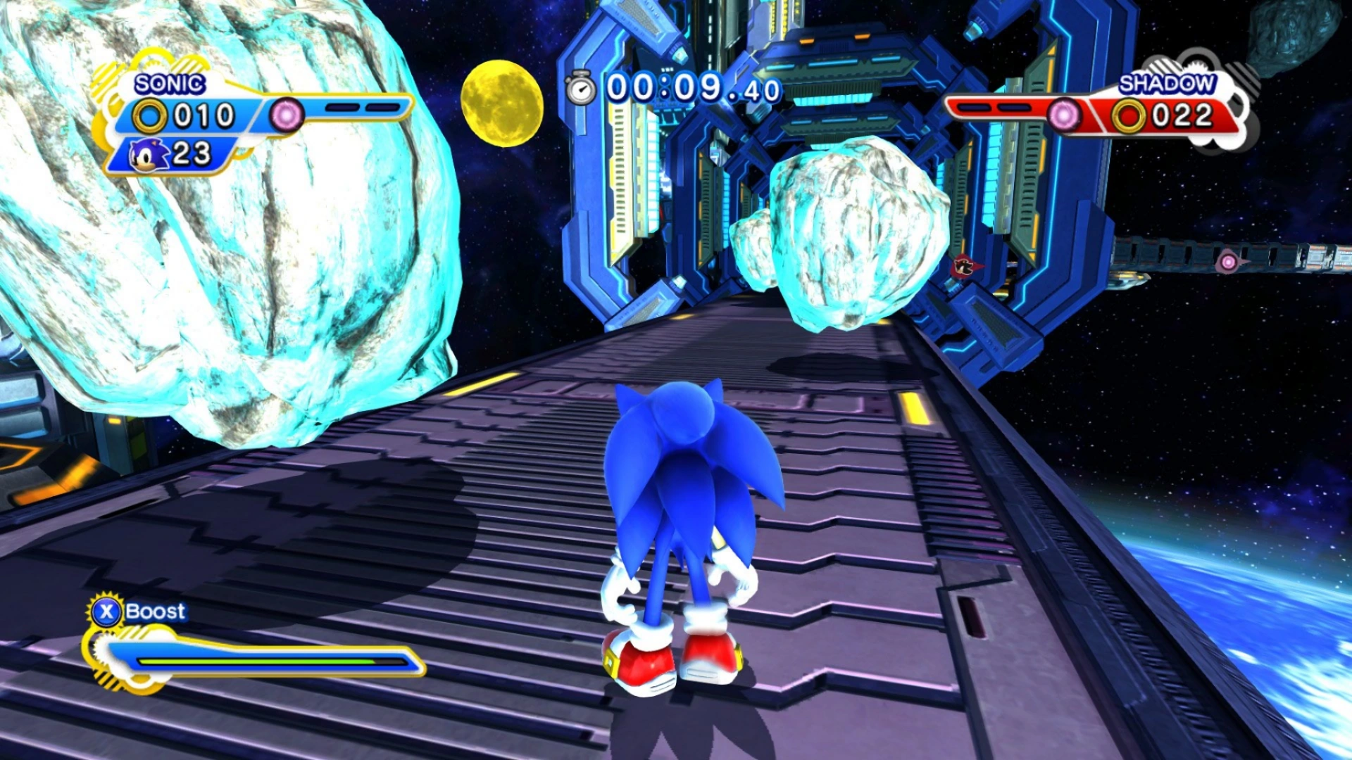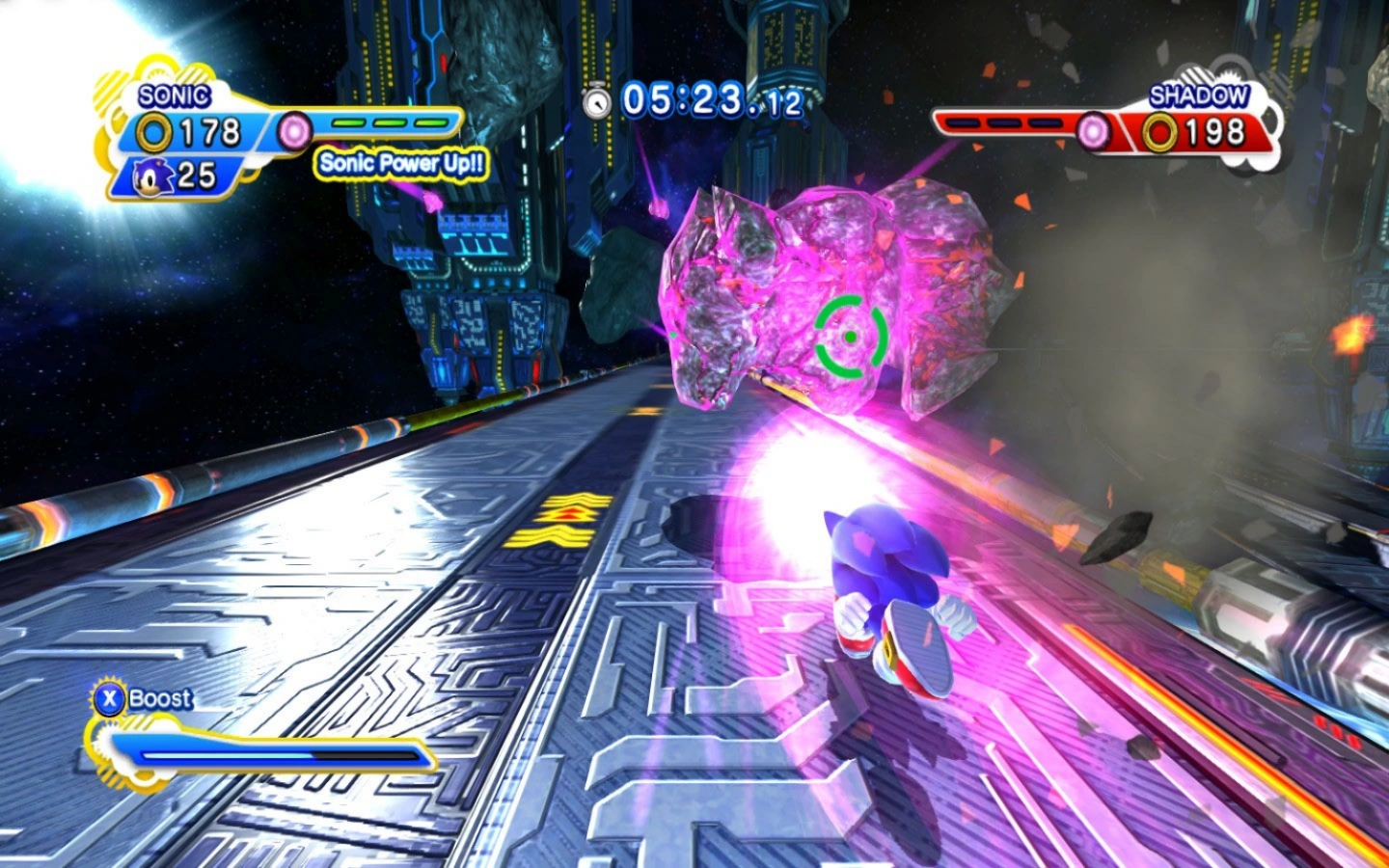 W Sonic Generations meteoryty pojawiają się podczas walki z Shadowem. Unoszą się na trasie i są stosunkowo nieszkodliwe. Mogą jednak spowolnić Sonica jeśli ten w nie wbiegnie. Meteory można łatwo zniszczyć wbiegając w nie podczas wykonywania Pędu. Niszcząc meteory Sonic uzupełnia Licznik Pędu. Podczas wykonywania swojego specjalnego ataku, Sonic musi niszczyć fioletowe meteoryty wykonując Pęd. Po zniszczeniu meteoryt rozpada się na trzy kawałki, które uderzają w Shadowa i spowalniają go. Gracz musi w ten sposób spowolnić Shadowa, aby dobiec do niego i pokonać go.