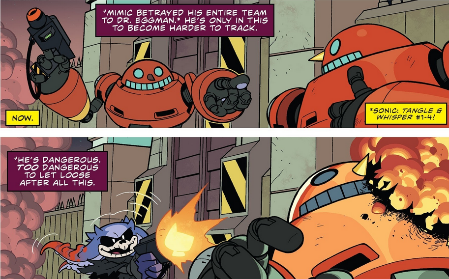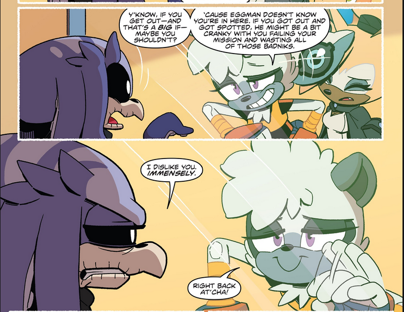 Gdy jego kłamstwo wyszło na jaw, Eggman był wściekły na Mimica, grożąc że wyśle przeciwko niemu Metal Sonica, który przejrzy każde jego przebranie. Mimic czuł się nerwowo słuchając gróźb Eggmana, twierdząc że nie był wobec niego wyrozumiały domagając się dowodów na śmierć Whisper, która powinna była wyparować w zastawionej przez niego eksplozji. Chciał także przekonać Eggmana, aby zajął się czymś innym niż ściganiem jednego najemnika. Pomimo tego był w stanie odważyć się na uciszenie doktora i poproszenie go o wsparcie w postaci Badników.