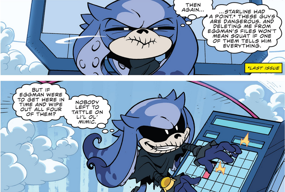 Mimic początkowo nie był chętny do współpracy ze Starlinem w zemście przeciwko Eggmanowi, woląc unikać złego doktora po wszystkim co między nimi zaszło. Dał się jednak przekonać, gdy Starline zaoferował mu wykasowanie go z kartoteki Eggmana. Mimo tego Mimic pozostawał nieufny i sceptyczny wobec Starline'a, na każdym kroku zadając mu pytania o jego plan, ku narastającej irytacji doktora.
