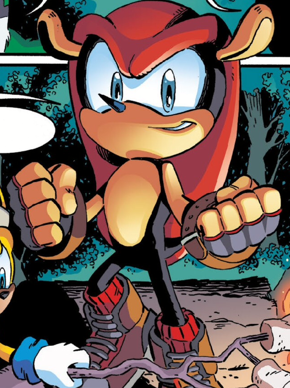 W komiksach Mighty pochodził z rodziny złodziei. Był jeszcze zbyt młody, aby zrozumieć czyny swoich rodziców. Kiedy ci trafili do więzienia, Mighty próbował znaleźć sposób na uratowanie ich i wkrótce spotkał się z mamutem Mogulem, który obdarzył go super siłą. Jednakże nawet mimo posiadania nowych mocy nie był w stanie uwolnić swojej rodziny. Zawiedziony udał się na wygnanie i wkrótce dołączył do zespołu Chaotix. Mighty dowiedział się potem od Espio, że jego zaginiona siostra Matilda wciąż żyje, ale została zmuszona dołączyć do Dark Egg Legion. Kiedy Mighty ocalił swoją siostrę okazało się, że ta go nie pamiętała ponieważ w bardzo młodym wieku przeszła proces robotyzacji. Jednak Ray zdołał przekonać Matildę do tego jak bardzo Migthy'emu na niej zależy. Ostatecznie Matilda ocaliła Mighty'ego, osłaniając go od eksplozji. Matilda była ranna i nie mogła wrócić z Mightym na Anielską Wyspę, ale obiecali sobie że kiedyś się spotkają.