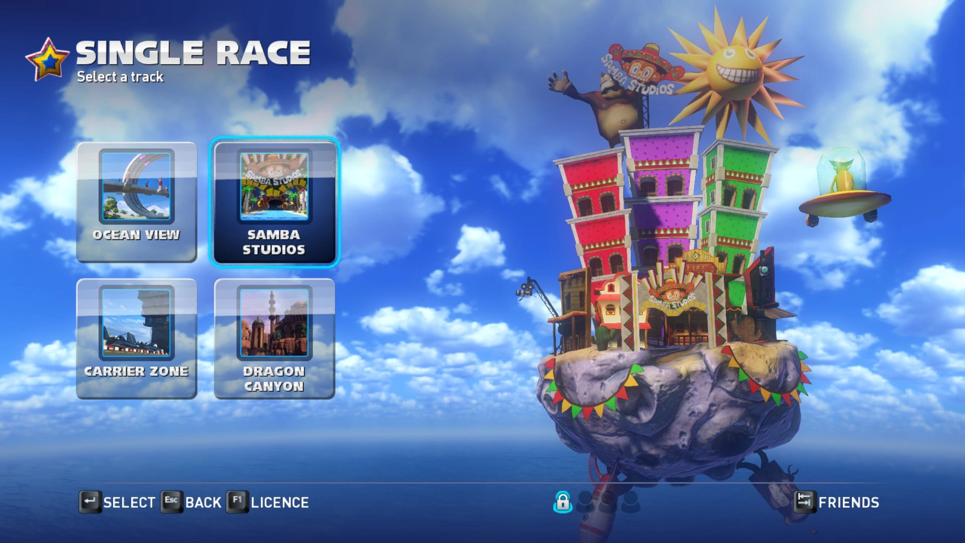 Samba Studios położone jest na obszarze różnych planów filmowych w studiu samby. Wyścig rozpoczyna się w otoczeniu imitującym Carnival Town. Zawodnicy wjeżdżają do zamkniętego studia, składającego się z zakręcającej cały czas w lewo trasy. W tle pojawiają się różne rośliny, a także ruchome modele zapaśnika walczącego z dinozaurem. U wylotu tunelu gracze transformują pojazdy w łodzie i wpadają do wody. Drugie studio biegnie wodną drogą przez środek karnawałowego studia. Po bokach pojawiają się drewniane mosty, tańczące budynki, statki pirackie, a nad wszystkim góruje uśmiechnięte słońce. Na samej drodze rozrzucone są pływające skrzynie i beczki na które trzeba uważać. Pojawia się także kilka drewnianych ramp, które mogą posłużyć do zdobycia prędkości. Kanał zakręca w prawo i wjeżdża na plan imitujący Dziki Zachód. Gracze ponownie transformują pojazdy w samochody i muszą przejechać przez westernowe miasteczko. Ten odcinek trasy składa się z dwóch, przeplatających się ze sobą tras. Wybierając trasą po prawej stronie gracz ma szansę na zdobycie potrójnego Firework. Należy tutaj uważać na kaktusy z marakasami. Po wyjechaniu z miasteczka gracze wjeżdżają na plan filmu o kosmosie. Składa się on z kanału zalanego pomarańczową wodą, która imituje lawę. Nad trasą unoszą się statki kosmiczne. Podobnie jak w pierwszym wodnym segmencie pojawiają się tu rampy na których można zdobyć prędkość. Na końcu planu filmowego gracze ponownie spadają do karnawałowego miasteczka i przejeżdżają przez metę. Wszystkie okrążenia są takie same.