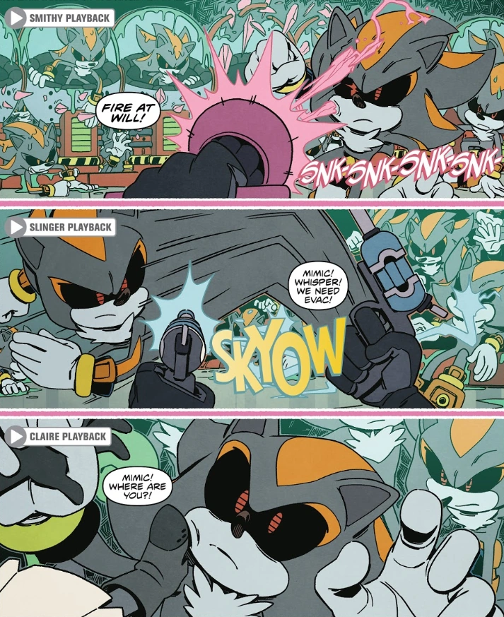 W komiksach IDW Shadow Androidy są elitarnymi robotami stworzonymi przez Doktora Eggmana. Posiadają historię taką samą jak w grach, aż do Sonic Forces. Wyglądają tak jak pomarańczowy Shadow Android z gry Shadow the Hedgehog. W trakcie wojny z Ruchem Oporu Mimic, w ramach współpracy z Eggmanem, zwabił grupę Diamond Cutters w zasadzkę, gdzie zaatakował ich cały oddział Androidów. Z tego też powodu Whisper, która jako jedyna nie wpadła w zasadzkę i przeżyła, nie czuje się dobrze w towarzystwie Shadowa.