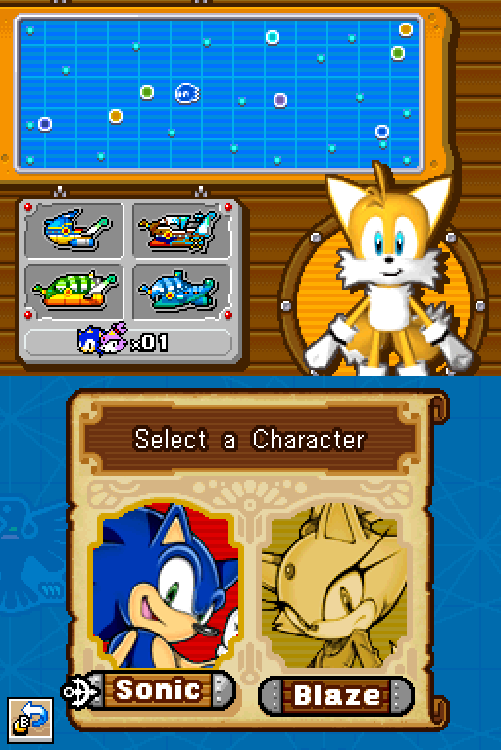 Pomarańczowy, dwuogonowy lis. Najlepszy przyjaciel Sonica i jego prawa ręka. Tails posiada bardzo wysokie IQ, pozwalające mu konstruować różne maszyny, oraz narzędzia użyteczne dla Sonica i jego przyjaciół. Tails jest także bardzo szybki, może latać za pomocą swoich ogonów, oraz wykorzystywać je do ataku. Razem z Soniciem zostaje przeniesiony do Wymiaru Sol, gdzie poznaje Marine. Później łączy siły z Blaze i ruszają na wyprawę, w celu odzyskania Jeweled Sceptera z rąk Kapitana Whiskera i jego piratów. Tails wykorzystuje swoją wyjątkowo wysoką inteligencję i umiejętności do budowy przeróżnych pojazdów, które umożliwią bohaterom poruszanie się po oceanie. |