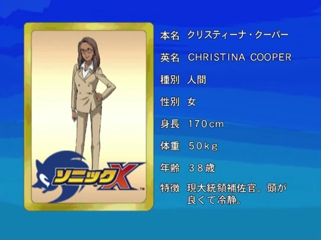 Это статья о персонаже из мультсериала «Соник Икс». Для секретаря президента из серии игр «Sonic the Hedgehog», см. Секретарь. Кристина Купер (англ. Christina Cooper, яп. クリスティーナ・クーパー — Курисутъи:на Куупа:) — персонаж из мультсериала «Соник Икс». В настоящее время она является советником президента, заменив Джерома Уайза после его увольнения.