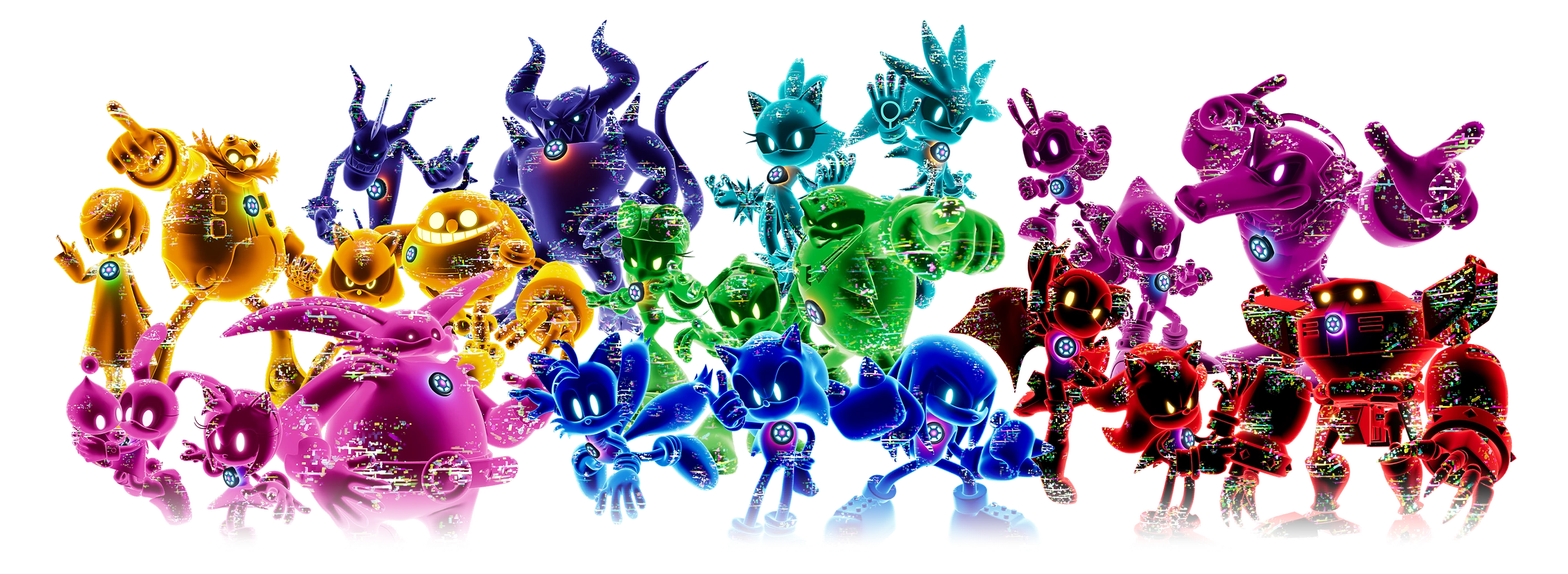 The AI Racers resemble the playable racers in appearance, with several notable differences. Their bodies are covered in a singular glowing color which differs depending on the team they are on, have glowing white eyes with no irises, and a glitching effect can be seen around several parts of their bodies. AI Racers also sport a glowing emblem on their chest depicting the tire in Donpa Motors' logo. When they "talk", their voice appears as warbled gibberish. Unlike the characters they are based on, they lack mouths, unless that character has an unconventional mouth design (namely Vector, the Deadly Six, and the Babylon Rogues), in which cases they keep their mouths, but do not move when they talk.