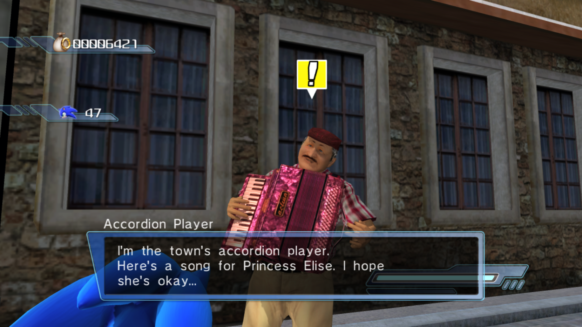 Like most other citizens of Soleanna, the accordion player has been deeply worried about Elise ever since she was kidnapped by Dr. Eggman . When spoken to, he goes into a performance of a song he wrote called "Beautiful Elise". This is a graceful ballad with very simple, but charming, lyrics: