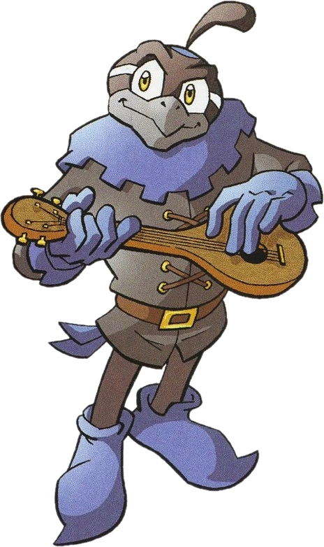 Alan is a mobian quail with gray and blue feathers. He has two light blue horizontal stripes that are found by his yellow eyes. His tail is blue, and his peak is a lighter shade of blue. For attire, he wears a gray tunic with a blue collar attached to a brown belt with a yellow buckle, and blue gloves and jester slippers.