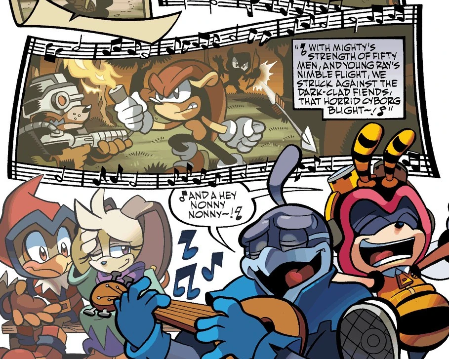 Alan using his cittern to attack Dark Egg Legion forces, from Sonic Universe #47.