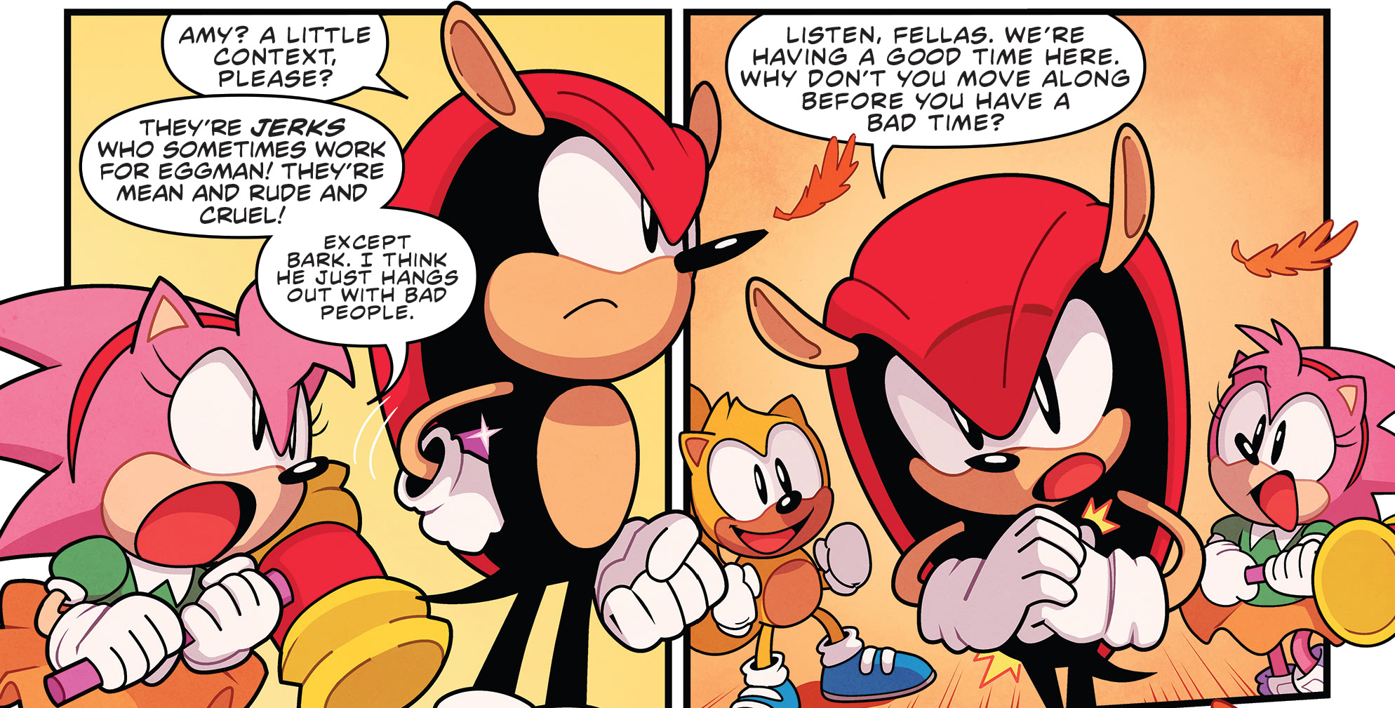 Tails and Amy would tell Sonic and Knuckles to stop arguing. Knuckles then ask the group what they're doing here and did something happen. Amy responds saying does something have to happen to come visit their good friend and Tails jumps in and says that they just wanted to check in on him and make sure he wasn't getting lonely. Tails further explains that it was Sonic's idea when Sonic says how it was a good idea and saying how he missed their "beautiful friendship" when Tails apologizes for being late saying how they got sidetracked. Knuckles then says how an unexpected adventure happens and knows them to well and asks what happened when Sonic starts by saying it started this morning.[59]