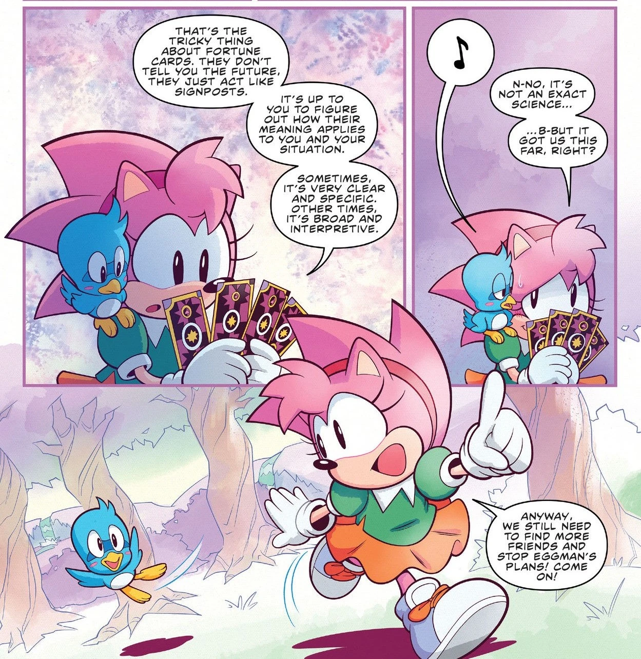 Amy and her animal friends are sitting at a table in Flower Field Zone and are starting a party. She brings out her tarot cards and recalls how they led to her meeting Sonic for the first time. Amy asks if she should do a reading and the animals encourage her. She takes the first card and is disturbed by what she picked up. She takes the animals into a flower field, saying the card wasn't encouraging and they need to find somewhere safe. Amy tells them to humor her as some look confused. Just then, Metal Sonic lands on the table at the scene. He looks around and sees no one which leaves to Amy and her friends' relief. Amy notes it looks like Metal was on the hunt, meaning Eggman is up to no good. She decides to do something about it and consults her cards. Amy says she will meet some familiar faces and her adventure is meant to be. She tells her friends to look out while she is gone, but a Flicky decides to come with her.