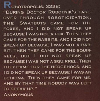 On route to Lady Lara-Le's apartment, ConstableRemington encounters trouble in the form of a dingo rally and protest. Exiting his vehicle, Remington tries to settle things peacefully, but several flaming Molotov cocktails thrown by an unknown individual eradicates that possibility. Things escalates beyond the constable's control as echidnas and dingoes alike begin to brawl; Remington is forced to call Haven for support. Knuckles is more than willing to get down to regular business and departs with Archimedes in a puff of smoke. While attempting to dispatch both dingo and echidna rioters, he receives unexpected help from none other than General Von Stryker. Lecturing his people on their behavior, the general is unaware of an Echidna attempting a sneak attack, but Knuckles intervenes. Showing contempt for his people's behavior as well, Knuckles suggested they take a cooling period for both sides while trying to resolve the problem. Knuckles asks what exactly set off the riot, and Stryker flatly replies "Too many broken Echidna promises!" and leaves with a threat of retaliation.