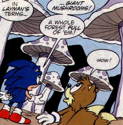 Antoine is amazed by the island as they approach it, but Sonic calls it a bit ball of dirt and completely harmless. Just then, artillery cannons attached to the bottom of the island start firing at them. Sonic notes the weapons and engines attached to the island weren't there before. They fly to the topside of the island and Sonic parachutes with Tails to the island. Tails asks if Sonic needs a lift, but Sonic says "being piggy-backed is bad for my image!" As they start to look around, Knuckles watches them in the shadows. The duo walks into a mushroom forest full of Giant Mushrooms. After being knocked down by a Pendulum, Sonic uses it to get up and hop along the top of a forest. Sonic then nearly gets hit by an ax from a Hey Ho. Sonic easily defeats the robot and continues on. As they move along, Sonic falls into a fissure the suddenly opened up under him, grabbing on to a ledge before he hits the bottom. A mysterious figure looks over him as he struggles to pull himself up.