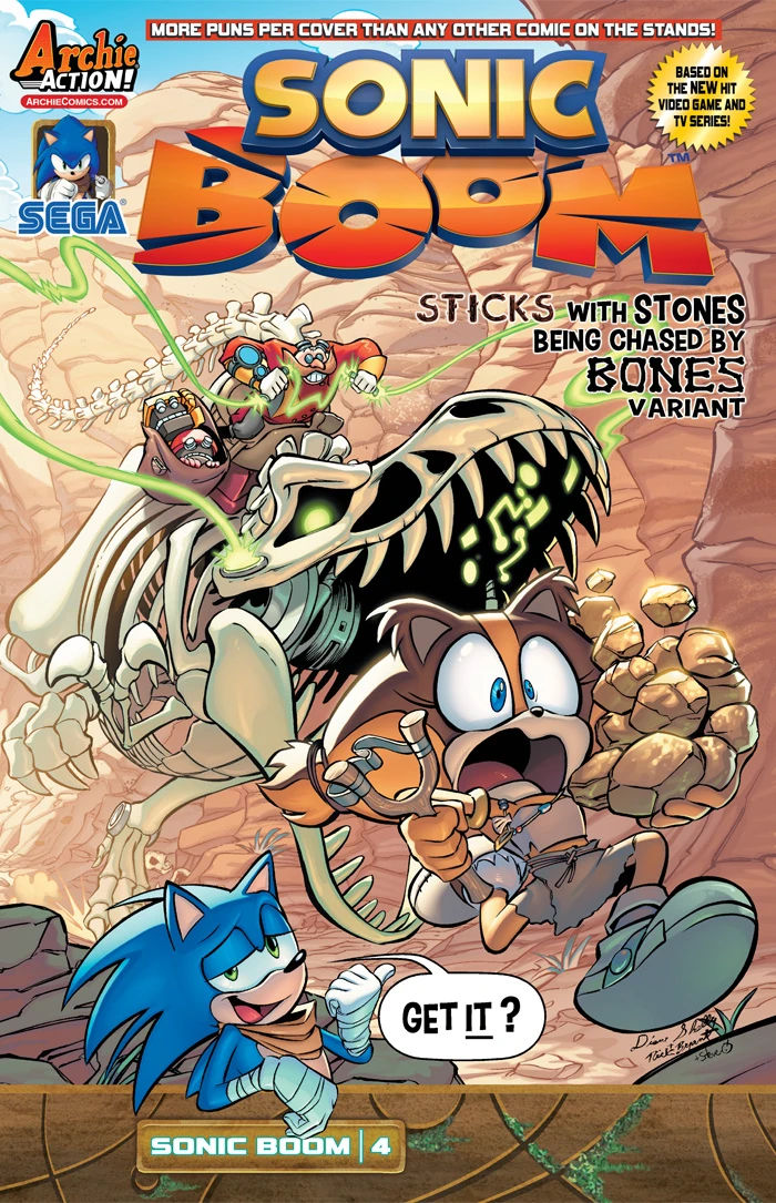 - The new ongoing Sonic comic book series from Archie Comics keeps on BOOMIN' with Sonic Boom #4: Sticks and Stones! Dr. Eggman's Big Boy mech has been refined into its final, deadly form. Sonic and his friends are on the ropes, but have no fear! Sticks has brought her secret weapon! It's a… wait, seriously? Sticks thinks that's going to help? Find out what her secret weapon is in the weird and wacky conclusion to the first story arc of the brand-new series Sonic Boom! Featuring cover art from Sonic art guru Tracy Yardley and an all-new 'Sticks-with-stones-being-chased-by-bones' variant cover from rising Sonic star Diana Skelly!