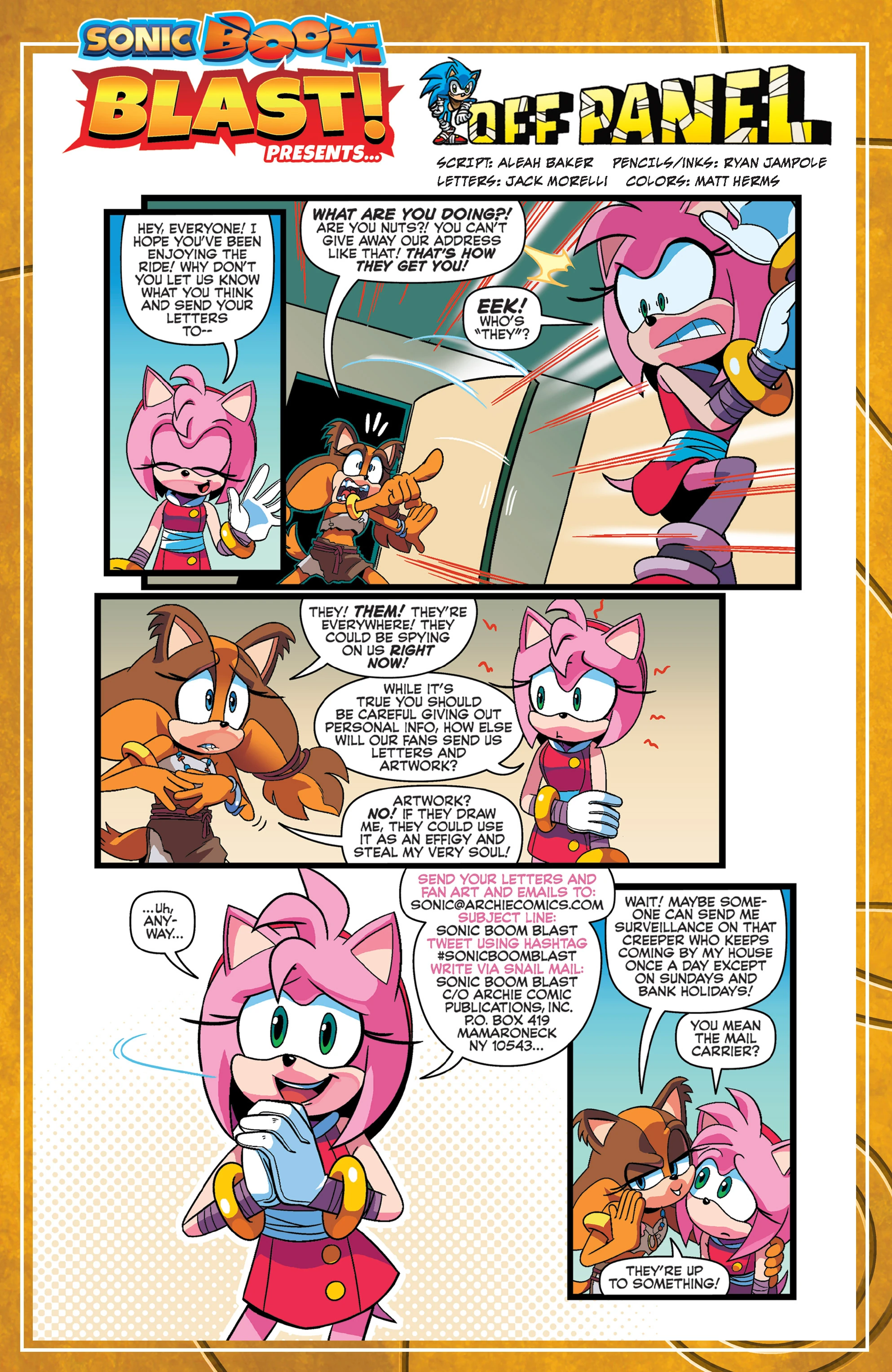 In a full-page edition of the Off-Panel strip, Amy greets the readers and begins to explain how fans can send in their letters and art. However, before she can reveal their address, Sticks bursts in and tells Amy horrified that she cannot give out their contact information as "they" would use it to get them. Amy asks what she means, and Sticks rambles about "them" and how "they" are spying on everyone. While Amy concedes you should be careful giving out personal information, she wonders how else the fans are going to send them their letters and artwork, the latter which Sticks objects, fearing that the art will be used as a method of stealing her soul. Ignoring it, Amy tells the readers where to send their letters and fanart. Just then, Sticks gets the idea that the fans could send her surveillance on the mail carrier for her house, who she is sure is up to something.