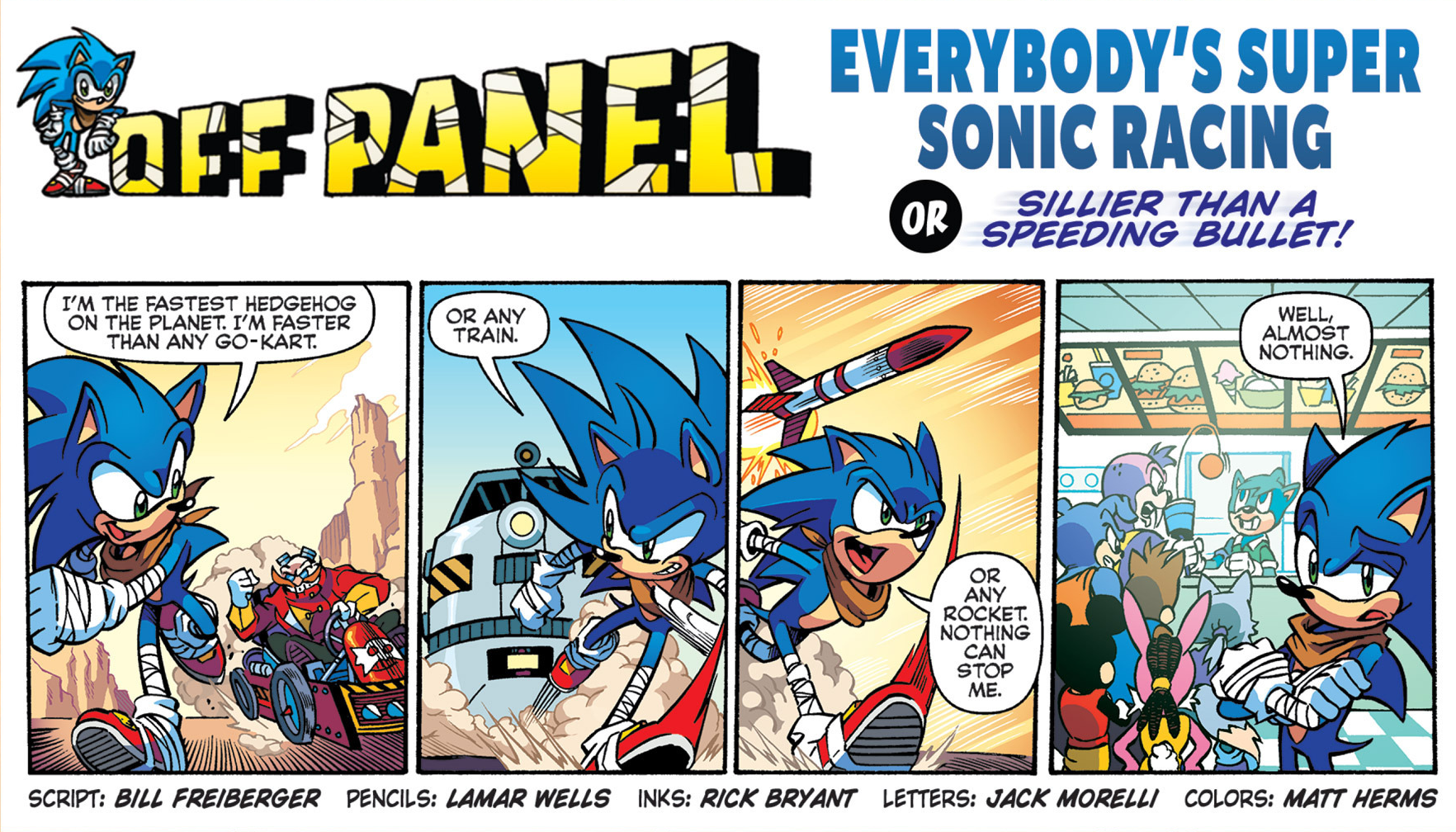 In a four-panel Off Panel strip, Sonic is bragging about how he is the fastest hedgehog on the planet, which he shows by outrunning Dr. Eggman in a go-kart, a train, and a rocket. Full of himself, Sonic proclaims nothing can stop him, but then the scene changes to him waiting in a long line on a fast-food restaurant, where Sonic corrects himself by saying that "almost nothing" can stop him.