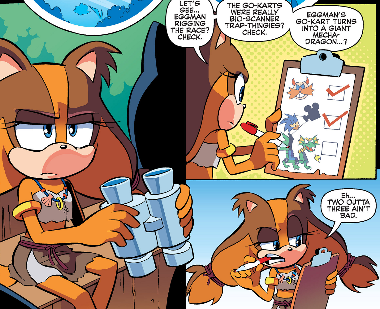 - Sticks predicted in Sonic Boom #6, "Everybody's Super Sonic Racing Part One", that Eggman's Go-kart Pan-island Grand Prix was a trap, that the go-karts would have Bio-scanning Who-za-ma-whats-its, and that Eggman's go-kart would turn into a "giant mecha-dragon-thingy."