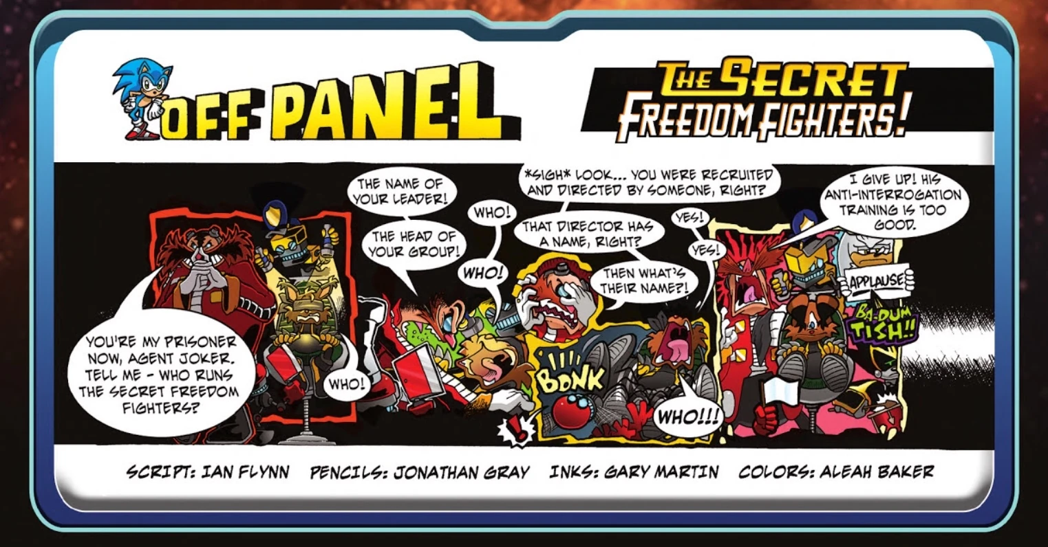 Dr. Eggman is shown with Larry captive and Orbot and Cubot restraining him. Having captured "Agent Joker", Eggman demands to know who runs the Secret Freedom Fighters. After three inquiries, all of which are answered with the name "Who" which Eggman fails to recognize as a name, Eggman gives up, claiming that Larry has been trained in resisting interrogation too well. Silver then appears holding an applause sign while Shard plays a drum and symbol in acknowledgement of the pun.