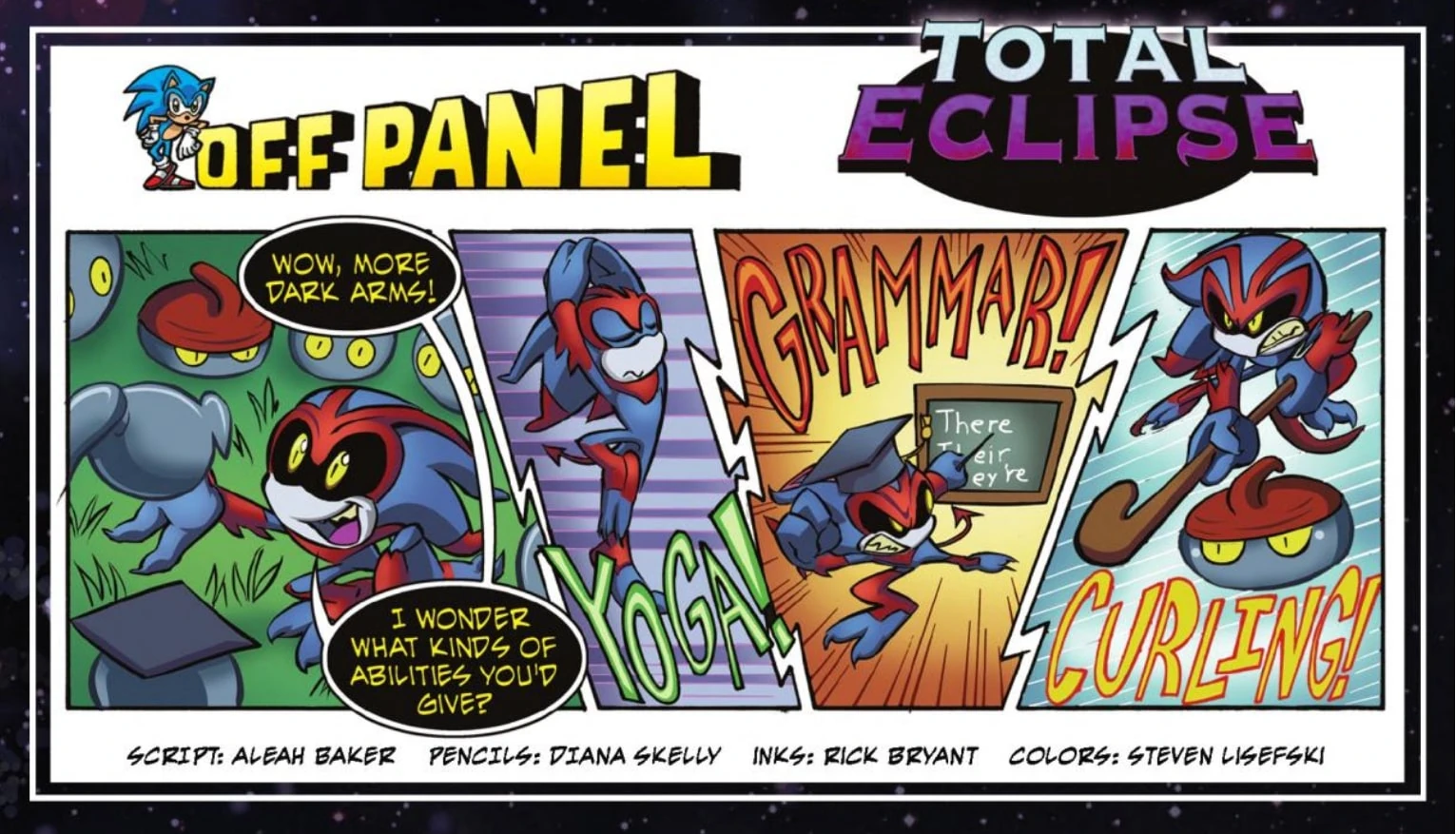 - "The first-ever Sonic Universe trilogy rolls on in 'Total Eclipse,' Part 3! As the Dark Trilogy inches closer to its shocking conclusion, it's a no holds barred battle between Knuckles and Shadow for the fate of Angel Island and the Master Emerald! As Sonic's top rivals clash, the rest of Team Dark and Relic are attacked by Eclipse and the terrifying power of the Dark Arms! Featuring all-new cover art from Tracy Yardley, Jim Amash and Ben Hunzeker, and part 1 of a 3-part connecting 'SUPER SMASH' collector cover set!"