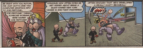 The editor prepares to talk with one of Archie's computer graphic artists, Joe Pepitone. Rotor overhears this and, surprised by the name, asks how often Joe is compared to outdated New York stereotypes. Joe beans Rotor in the head with a softball from his office.