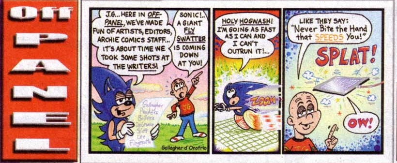 Sonic looks over a list and decides that, since they've made fun of everyone other production staff member, it was time to make fun of the comic's writers. Gabrie fearfully alerts Sonic to a giant flyswatter in the sky headed right for them. Sonic runs as fast as he can, but is squashed by the swatter. The editor tells Sonic that you should never bite the hand that "speeds" you.