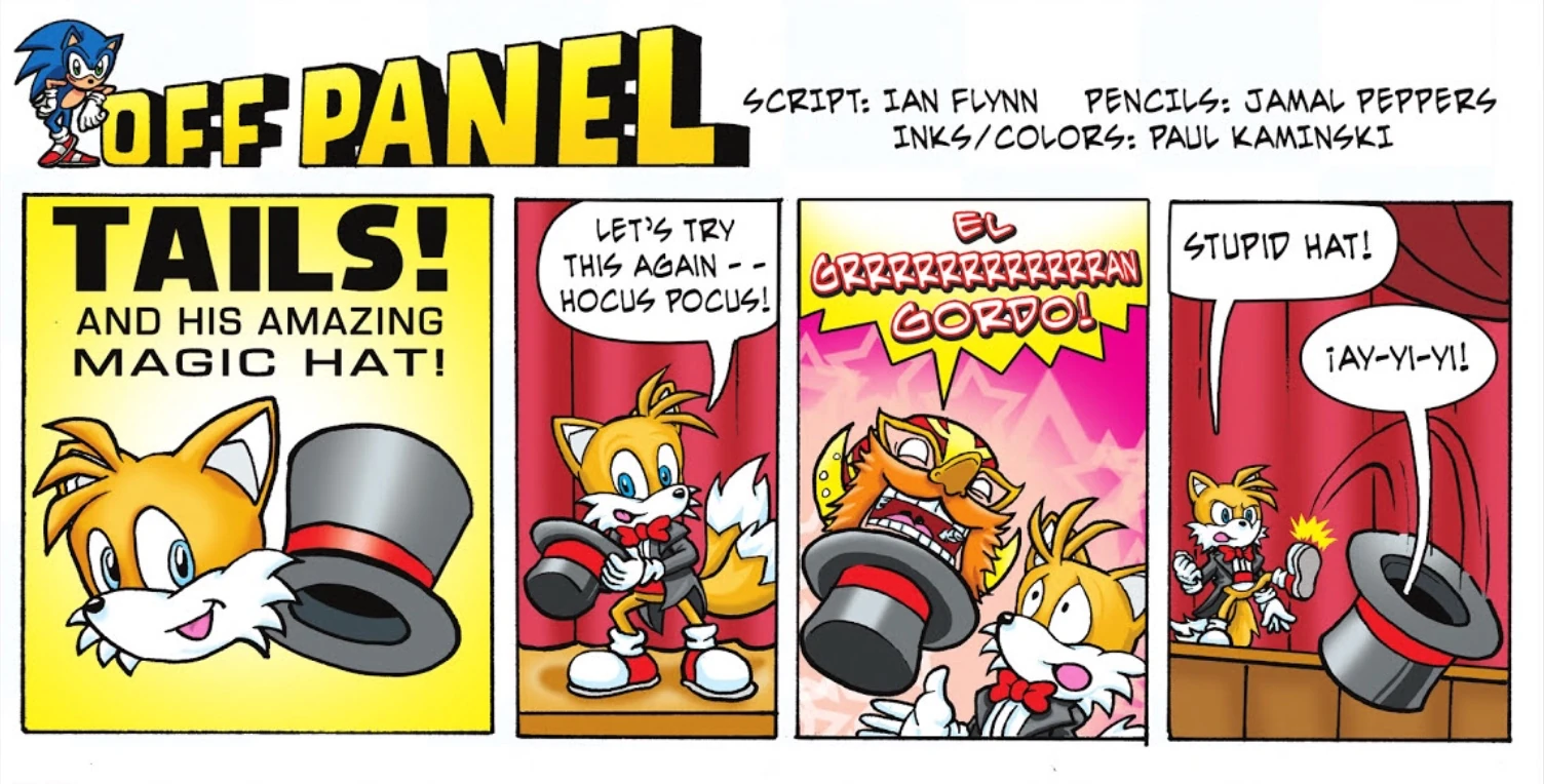 Tails is up on the stage with his hat once more, this time chanting "Hocus Pocus"! At that moment, El Gran Gordo pops out of the hat, startling Tails. Tails then kicks his hat off of the stage in frustration.