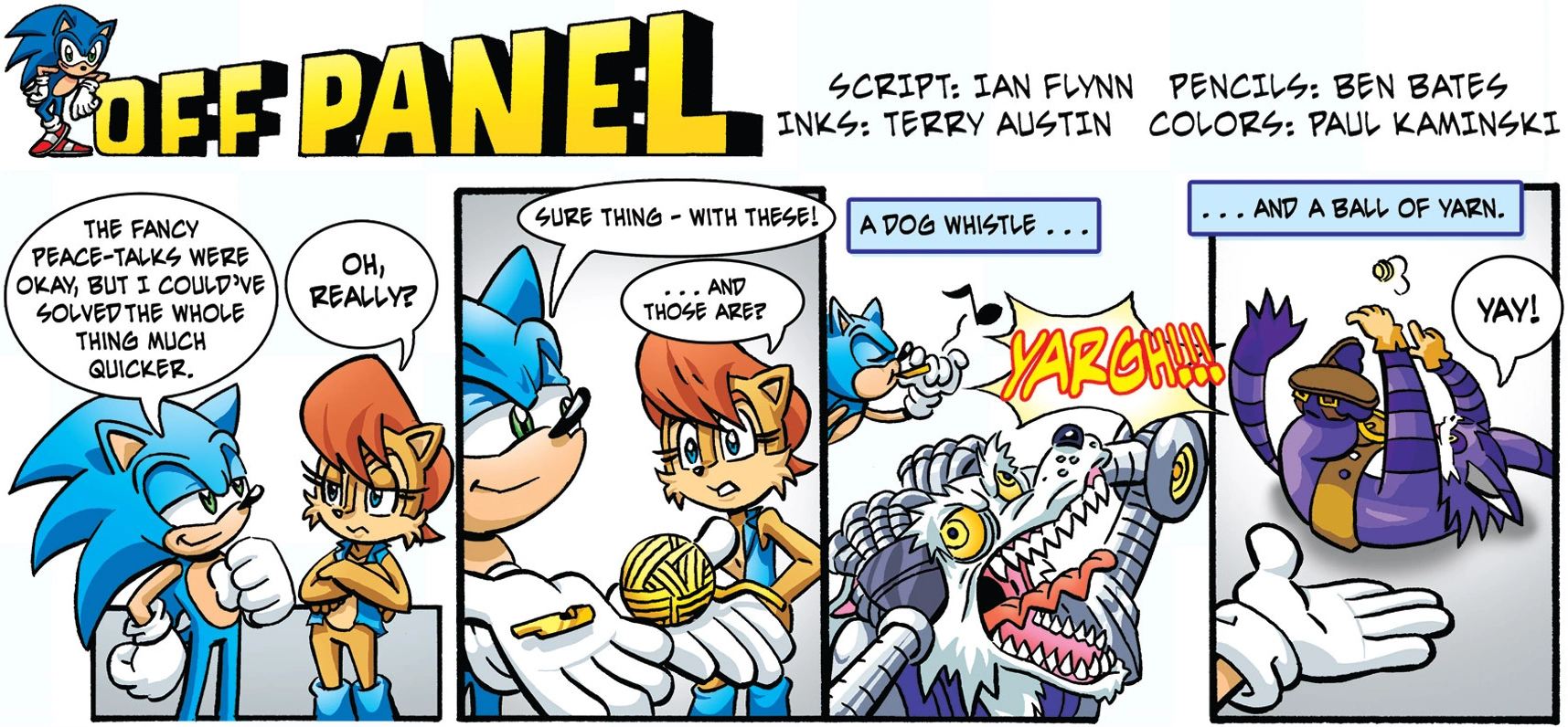 Sonic is telling Sally that the fancy peace-talks were okay, but he claims that he could've solved the whole thing much faster. Sally, not believing him of course, asks him how. He then shows a dog whistle in one hand and a ball of yarn in the other. Sally then asks him what they were. Sonic demonstrates the dog whistle by blowing it, causing Drago to go berserk. He then demonstrates the ball of yarn by throwing it to Big, who starts playing with it.