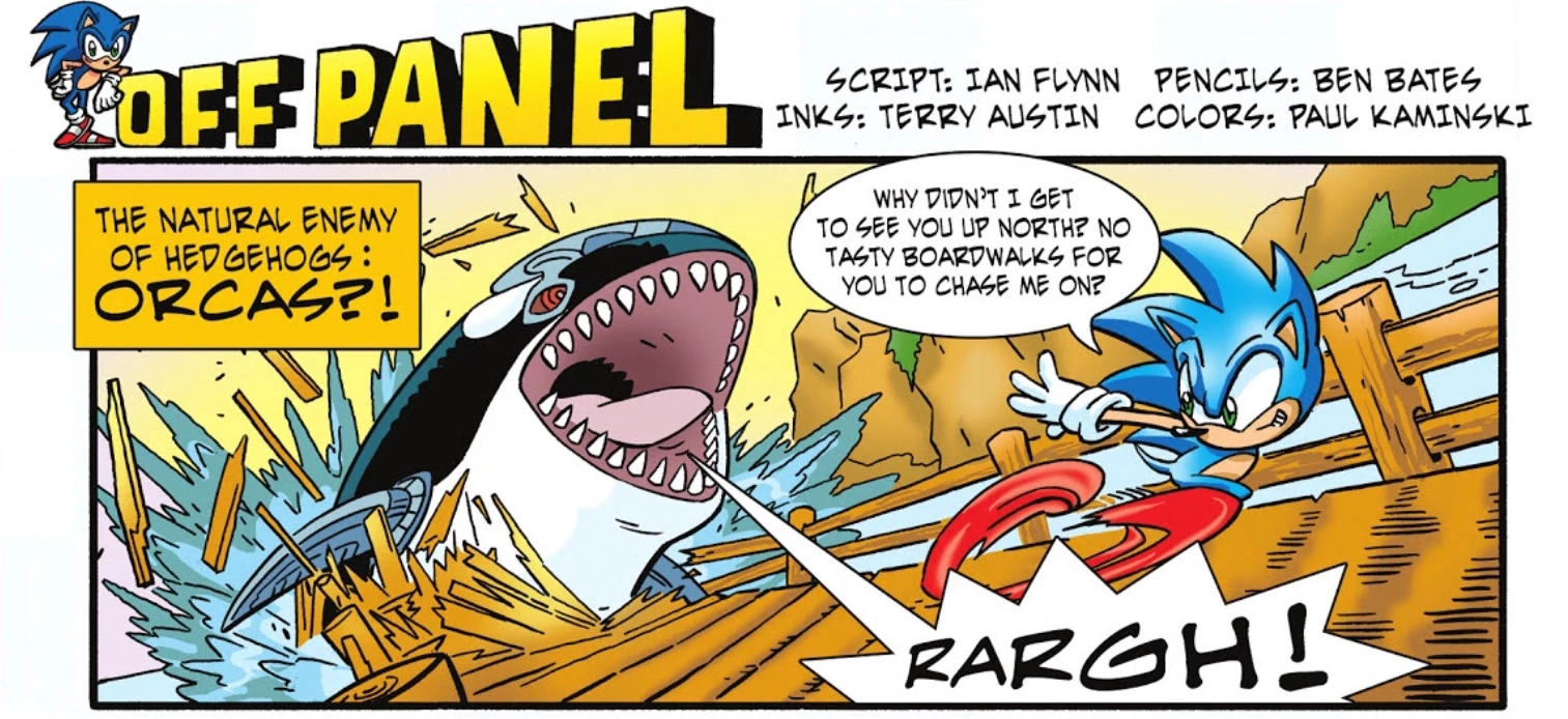 The Off Panel is a single panel with Sonic running from a Legionized orca at a beach on boardwalk saying, "Why didn't I get to see you up North? No tasty board walks for you to chase me on?" The text above the panel reads "The natural enemy of hedgehogs: Orcas?!"