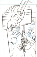 From the window, Elias and Rosemary look up in horror as Rotor, flustered, explains what they're seeing. Sally, Tails, Bunnie, Antoine, Amy and even Geoffrey look up in shock. In the marketplace, Big the Cat picks up Froggy, Cream the Rabbit runs to her mother, Bernadette Hedgehog clings to her husband Jules Hedgehog, Rosie clutches her charges, Rory Bear, Sasha Cat, and Snaggle Tiger, and Dr. Quack and his family look on as a massive shadow begins to spread...