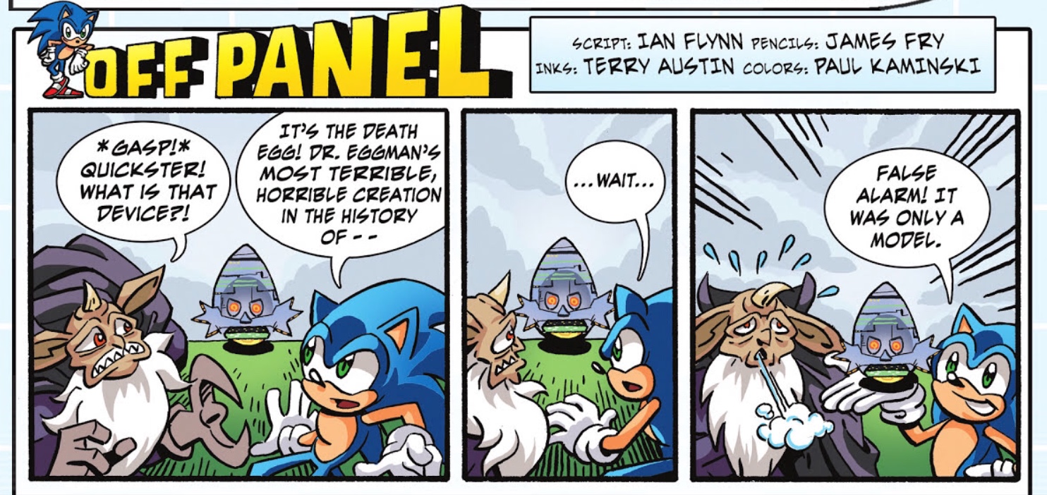 Ixis Naugus and Sonic are looking at the Death Egg Mark 2 looking shocked by its appearance. Sonic explains to Naugus that it is Dr. Eggman's most terrible creation. He interrupts himself and quickly realizes that it was only a model, to the relief of Naugus.
