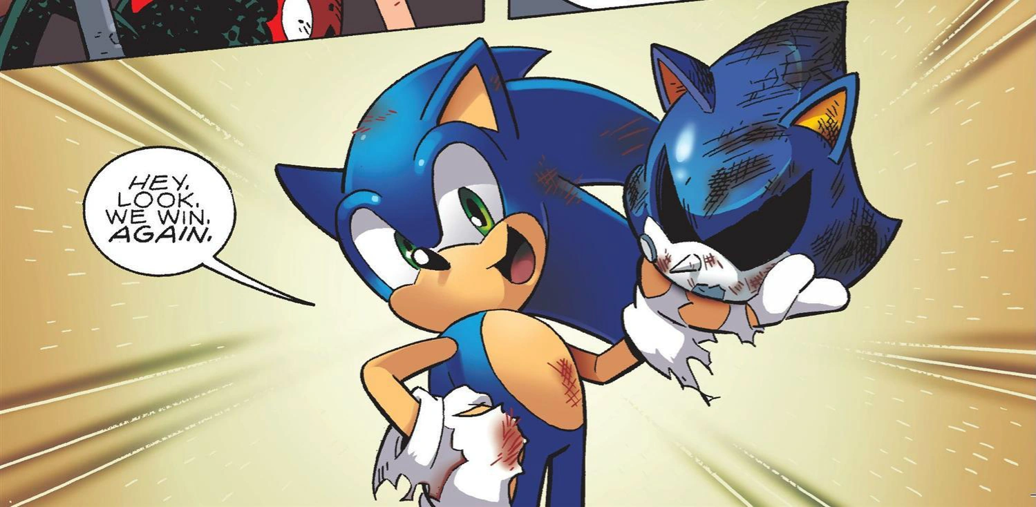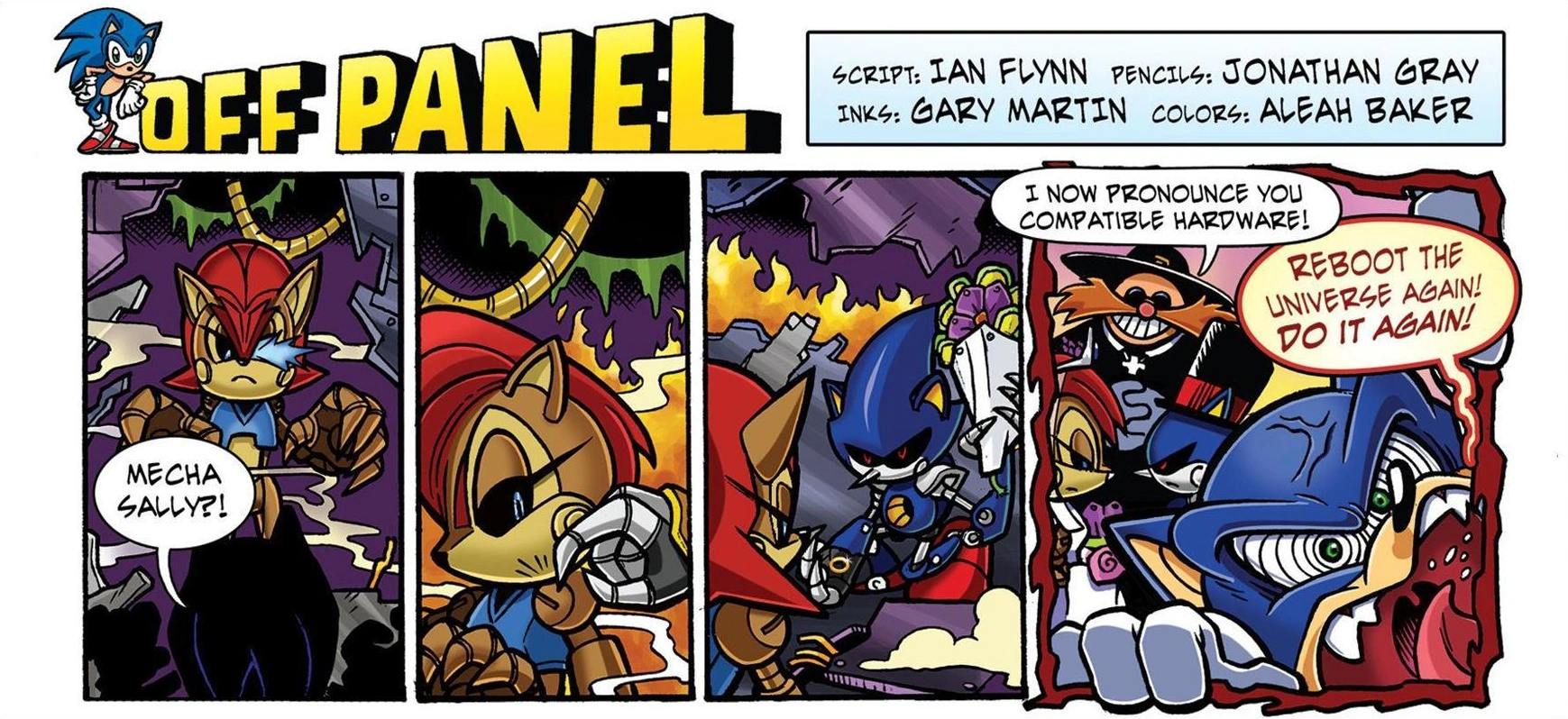 As Mecha Sally emerges from the ruins of the World Roboticizer, Metal Sonic taps her on the shoulder, presenting a ring and bouquet of flowers. Dr. Eggman marries the two, announcing them "compatible hardware", while Sonic yells for the universe to be reset again.