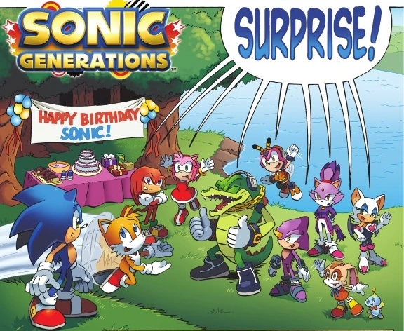 All of Sonic's friends surprise him with a birthday picnic on top of a hill. Just as the festivities get under way, however, a hole in the sky rips open and all of Sonic's friends are sucked in. Sonic looks into the hole and sees Green Hill Zone. He heads to there, not noticing that a past version of himself is watching.
